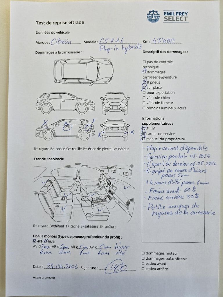 2 clésMap + carnet de service disponibleService prochain 05.2026Expertise dernier 06.05.2024Equipé en roues d'hiver pneus 5 mm+ 4 roues d'été pneus 6 mmFreins avant 60%Freins arriè 30 %Petits marques de rayures sur la carrosseriePas de contrôle technique (essai en aroute) effectué2 keysMOT certificate and service history availableNext service due 05/2026Last MFK 06.05.2024Fitted with winter tyres 5 mm+ 4 summer tyres 6 mmFront brakes 60%Rear brakes 30 %Minor scratches on the bodyworkNo workshop inspection (road test only) carried out