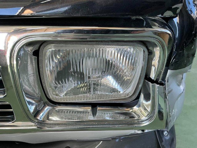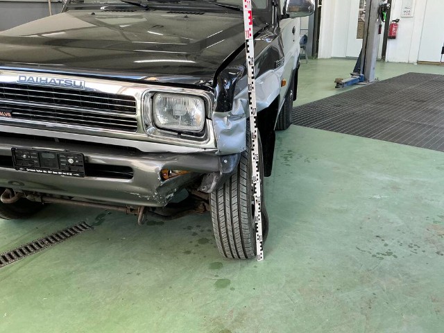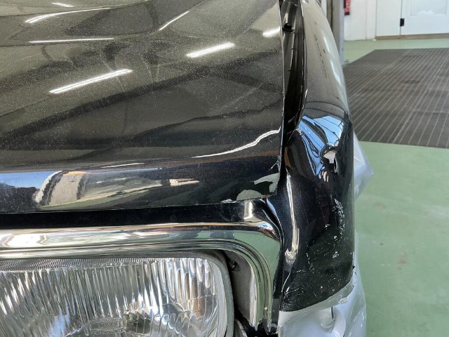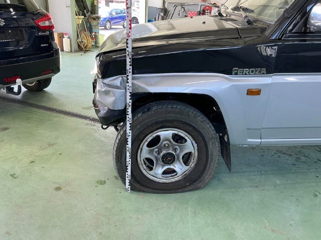 Linker vorderer Kotflügel ist verbogen. Frontstoßstange, vorderer Kotflügel, vordere Kotflügelverkleidung und Motorhaube sind eingedrückt. Kühlergrill der Frontstoßstange ist gebrochen. Linke Vordertür ist zerkratzt. Vorderradaufhängung links ist stark verschoben.