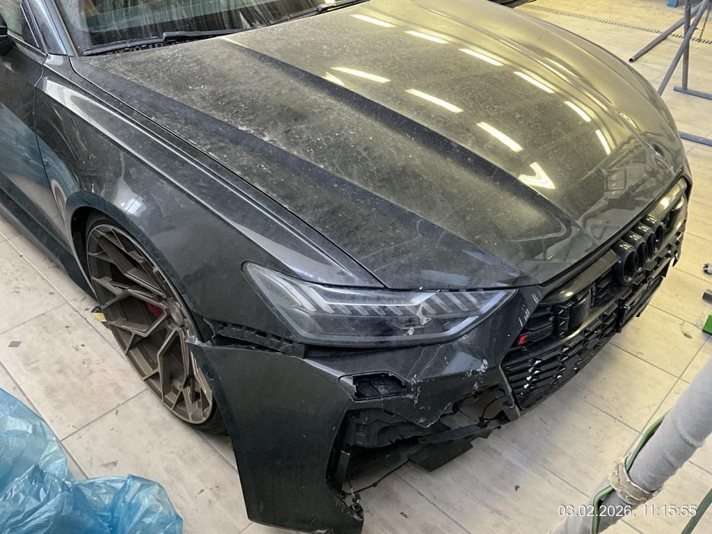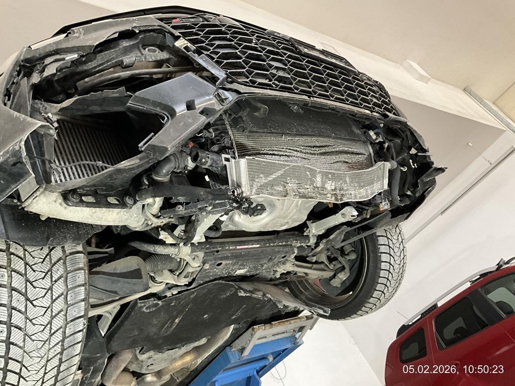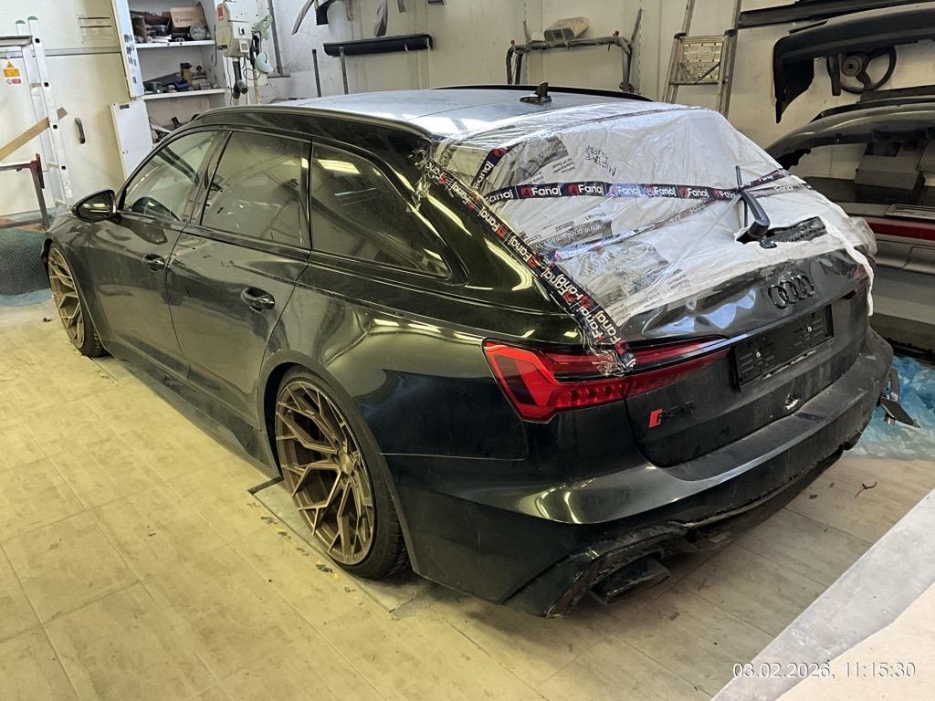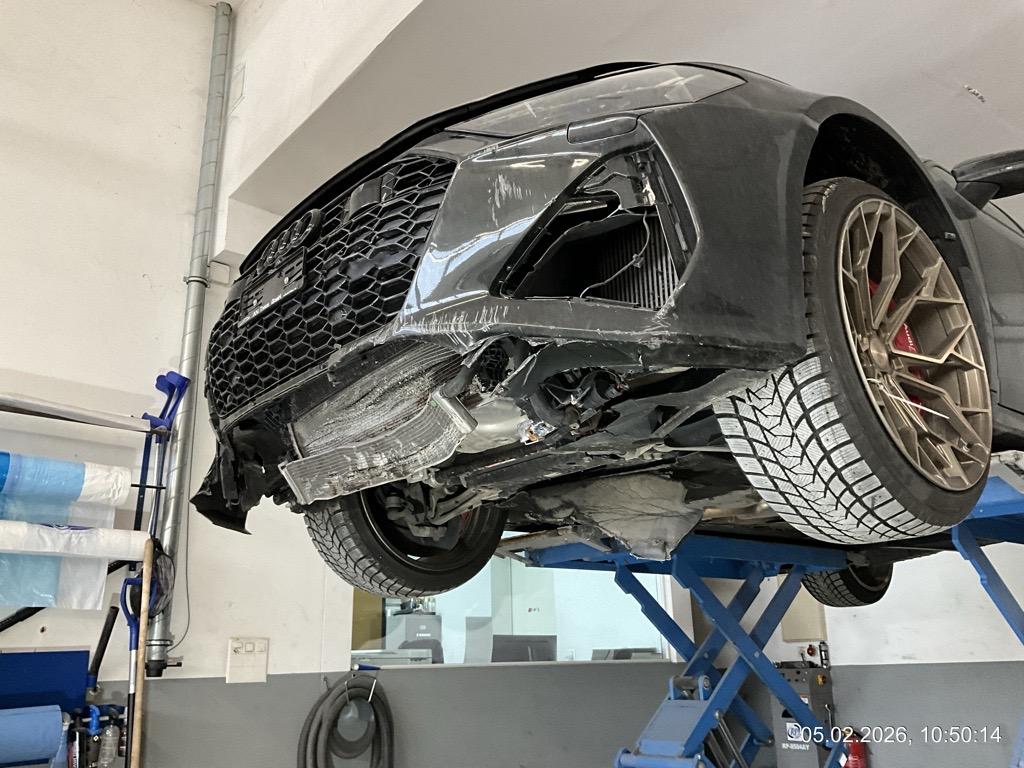 Front-/ und Heckschaden - Front: Motorhaube, Stossstange, Front unten innen alles eingedrückt, alle Kühler eingedrückt - AUFZÄHLUNG NICHT ABSCHLIESSEND / Heck: Stossstange, Heckklappe, Heckscheibe und Seitenwand hinten mitte/rechts eingedrückt. Boden und Auspuffanlage gestaucht - AUFZÄHLUNG NICHT ABSCHLIESSEND / Unfallhergang: ein LKW ist in das Heck des parkierten RS6 gefahren und hat diesen gegen eine Steinmauer geschoben. Motor läuft, das Fahrzeug ist fahrbar. Aber sicher Risiko Motor, Getriebe und weitere verdeckte Schäden. Kalkulation und Schadenaufnahme aber auf dem Lift gemacht. / Vorbestandene Schäden: Felge hinten rechts wurde geschweisst (im Ausland). Vorne mitte: Steinschlag