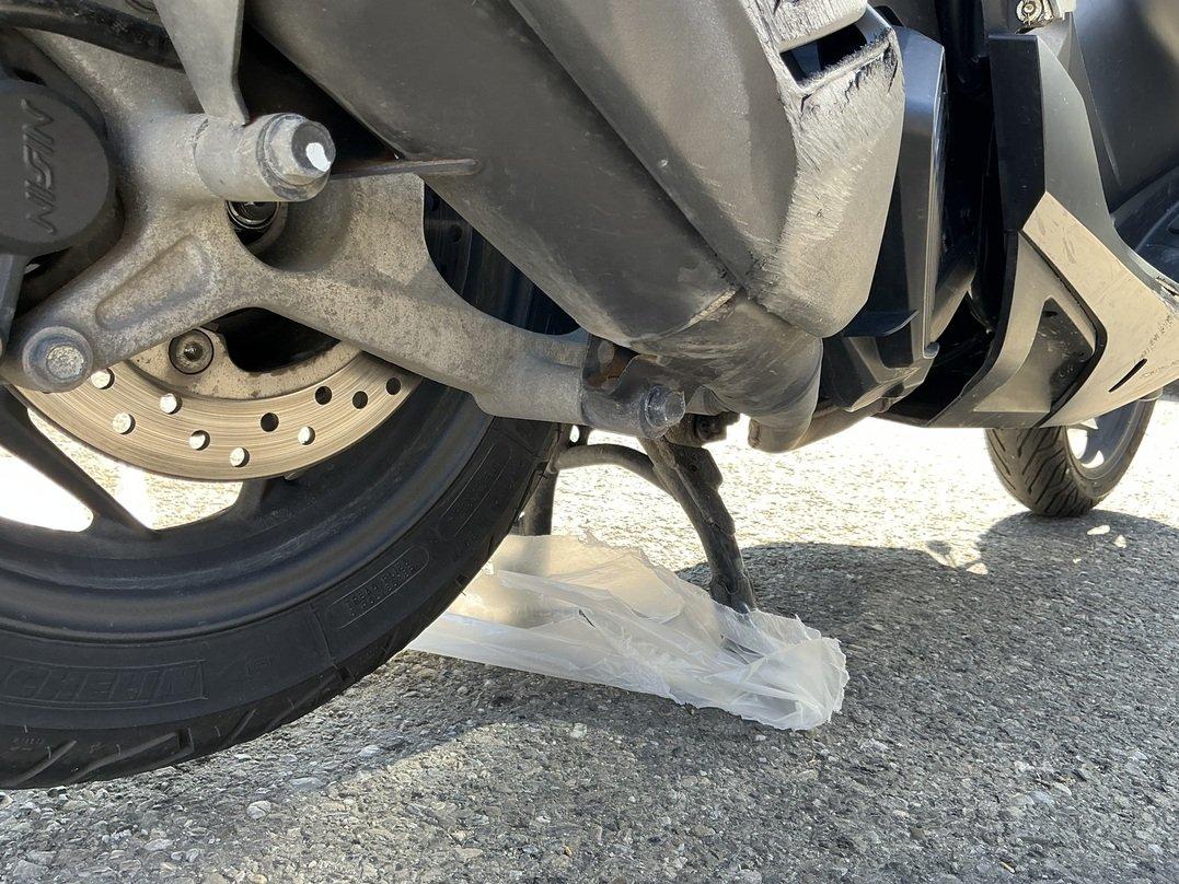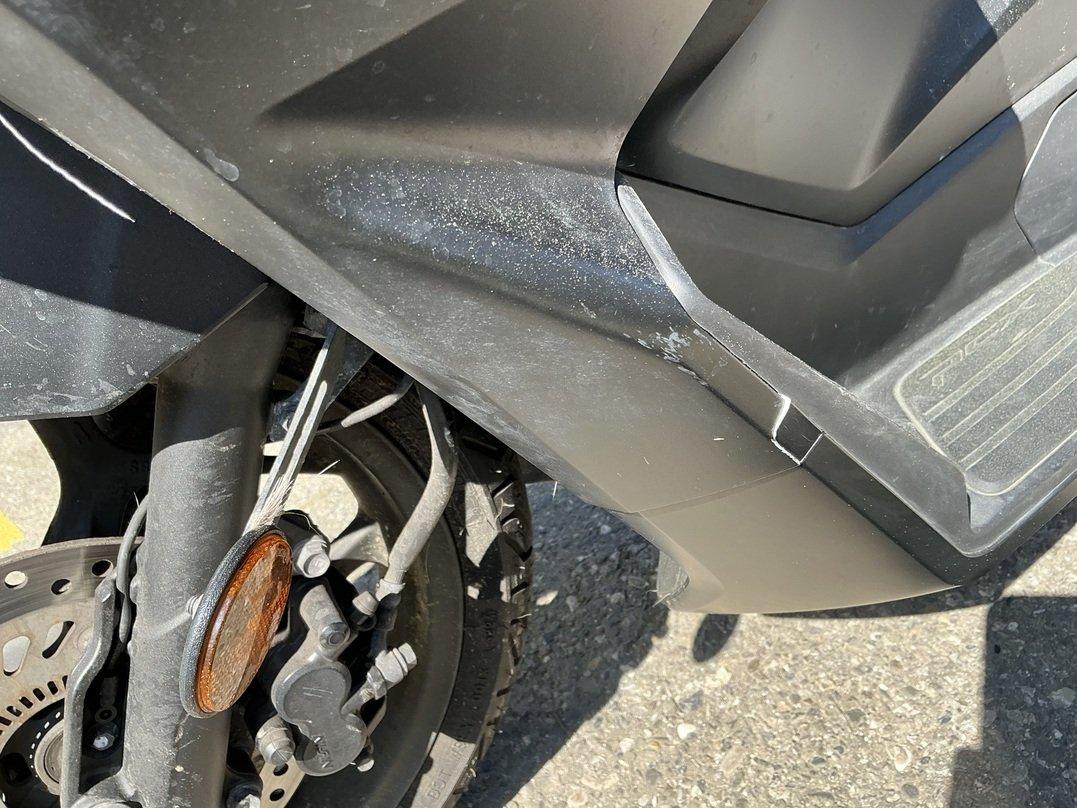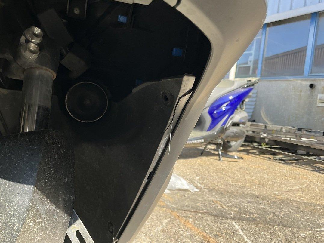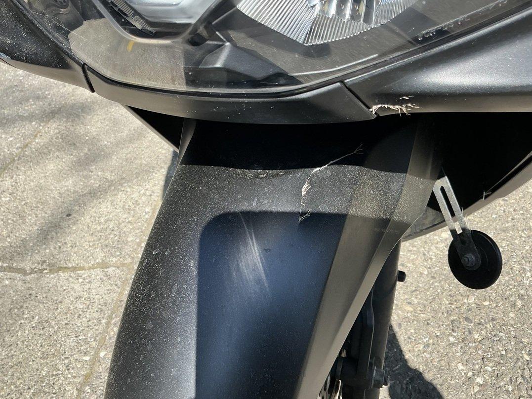 Collision animale : choc avant et chute sur le côté droit Pare-boue avant cassé Carénages avant cassés Feu avant griffé Carénages, côté droit, râpés Echappement râpé Levier de frein râpé