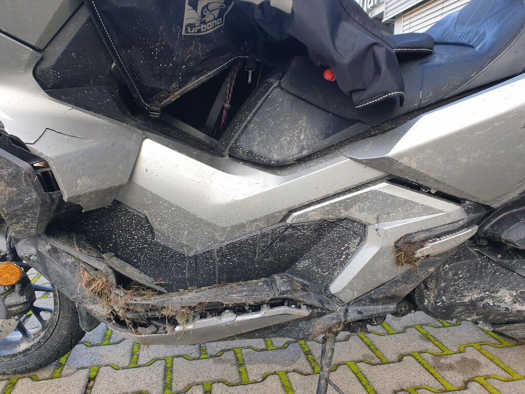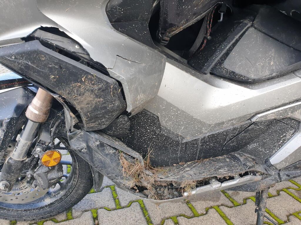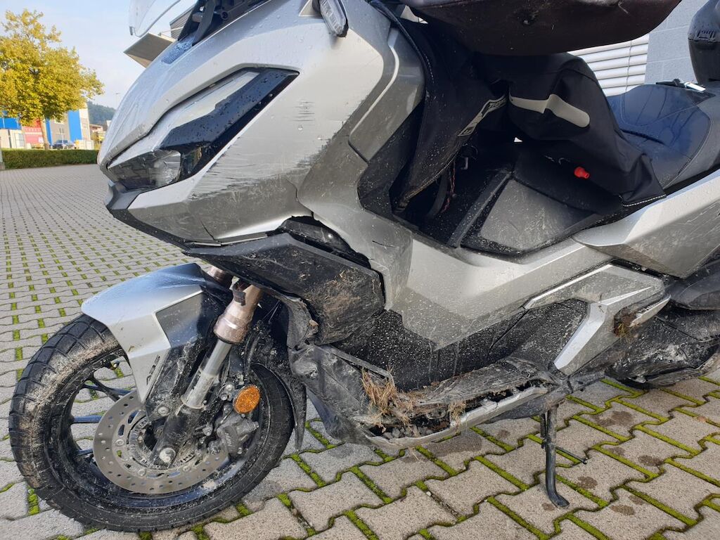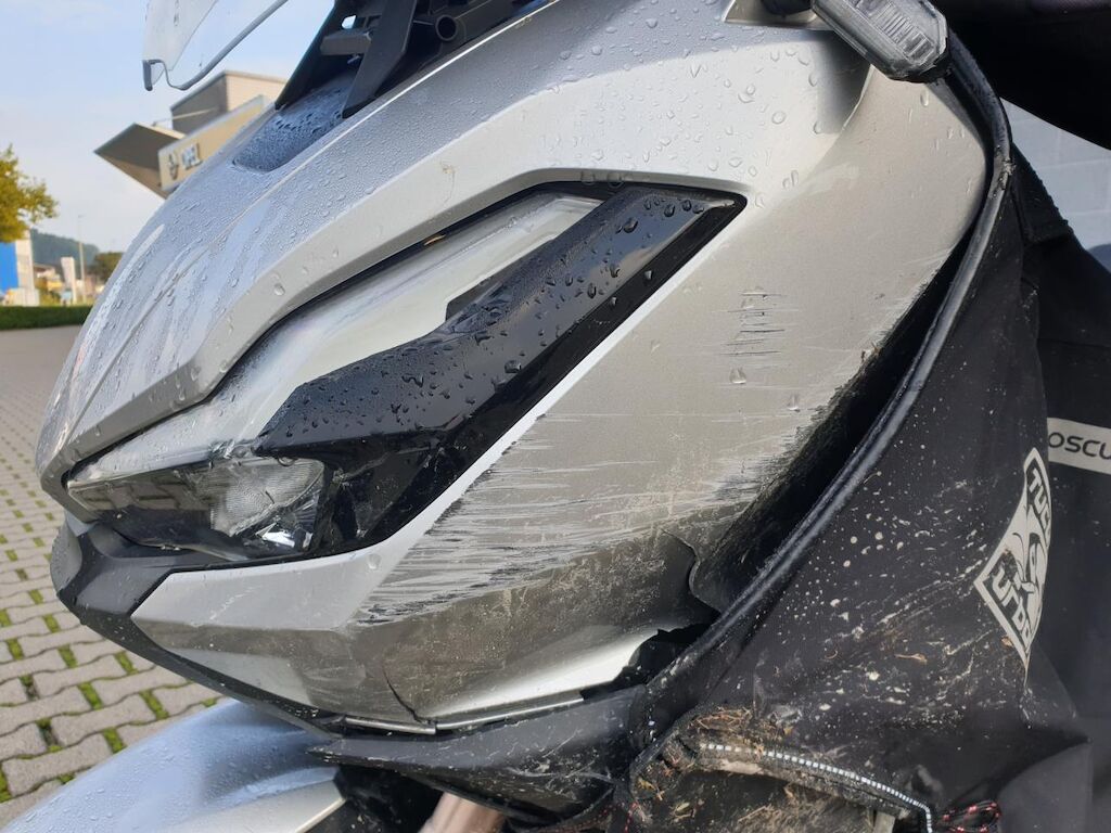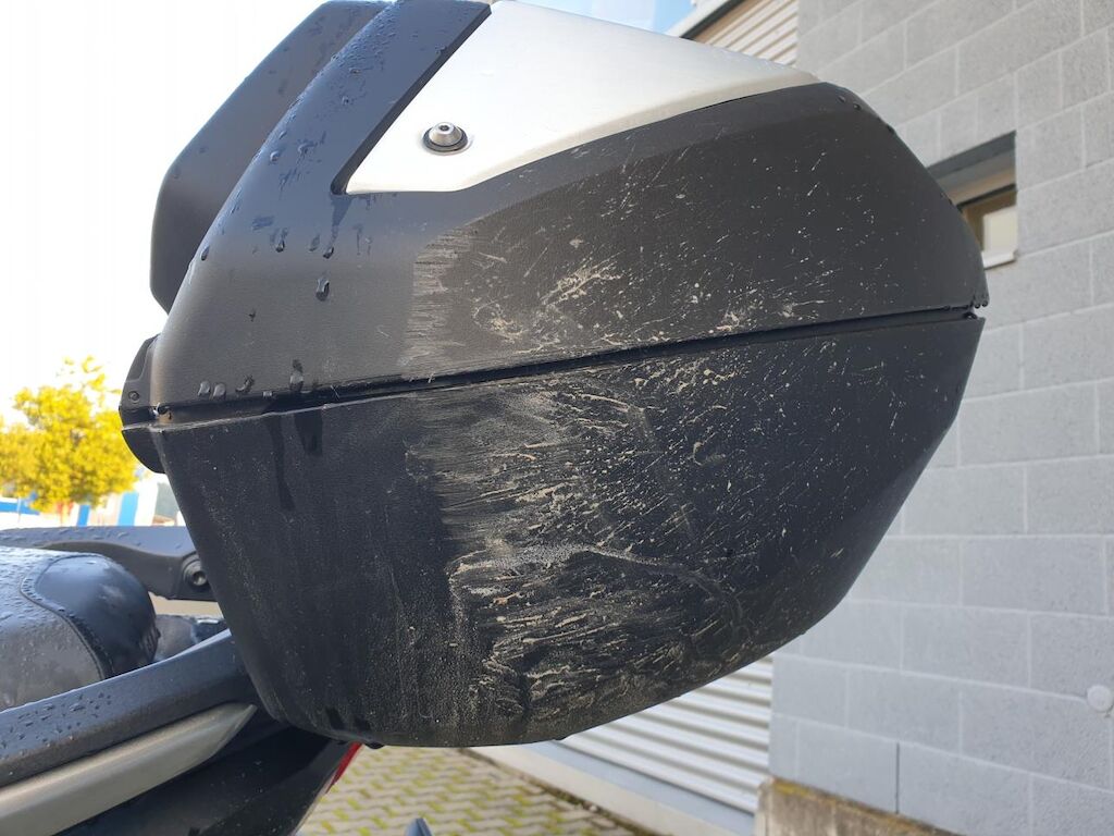 Seitenschaden links: Verkleidungen, Lenker mit Anbauteilen, Wärmeschutz, Scheinwerfer, Blinker, Schutzblech, Fussrasten, Heckbügel, Rahmen unten, Getriebedeckel, Ständer, Luftfilter und Topcase beschädigt. Risiko Gabel und Rahmen. Motor Getriebe Vorderachse Hinterachse Airbags ausgelöst: 0 unbekannt ( Abfallcode 16.01.04ak )