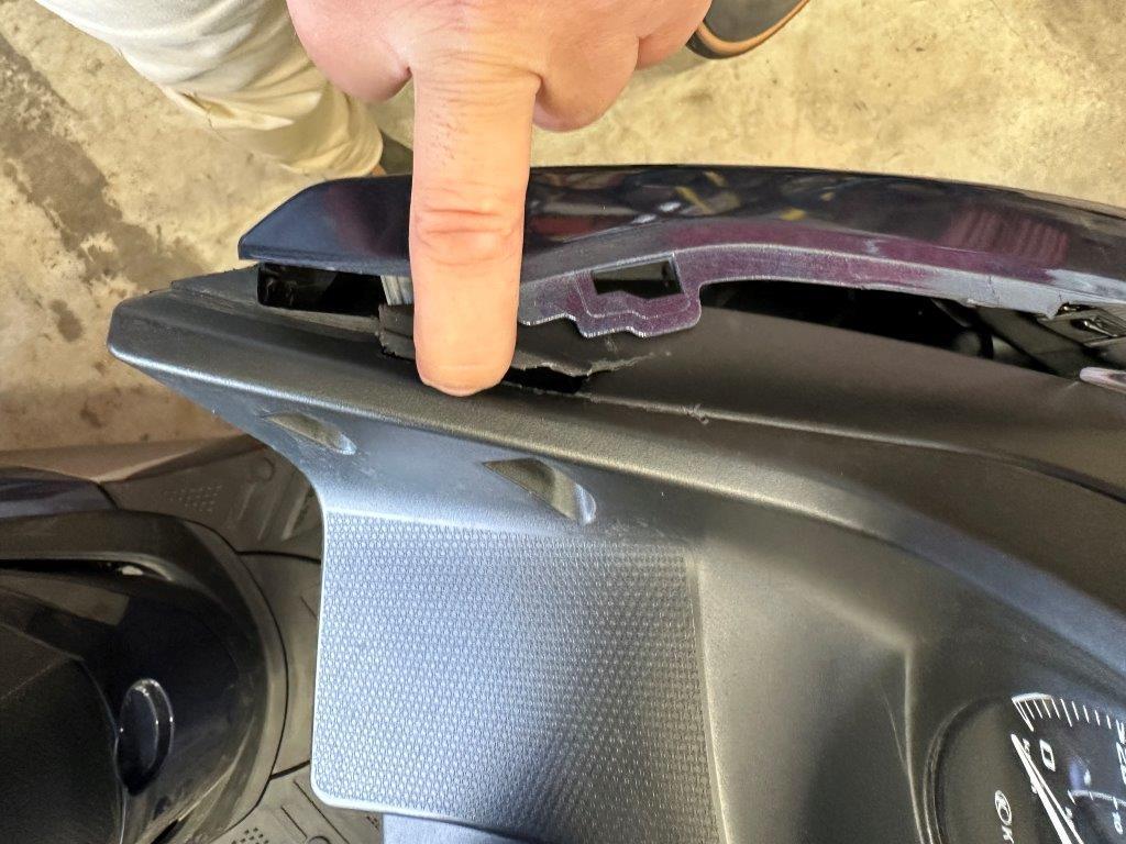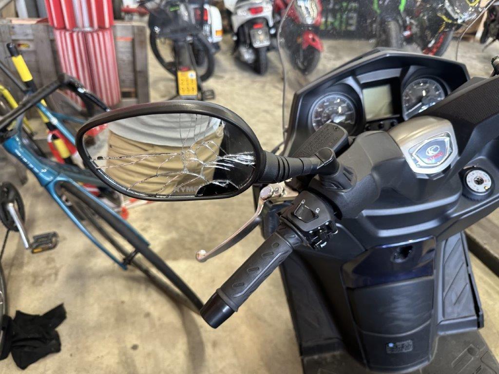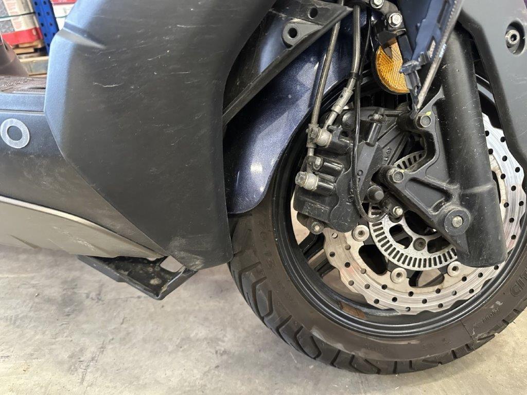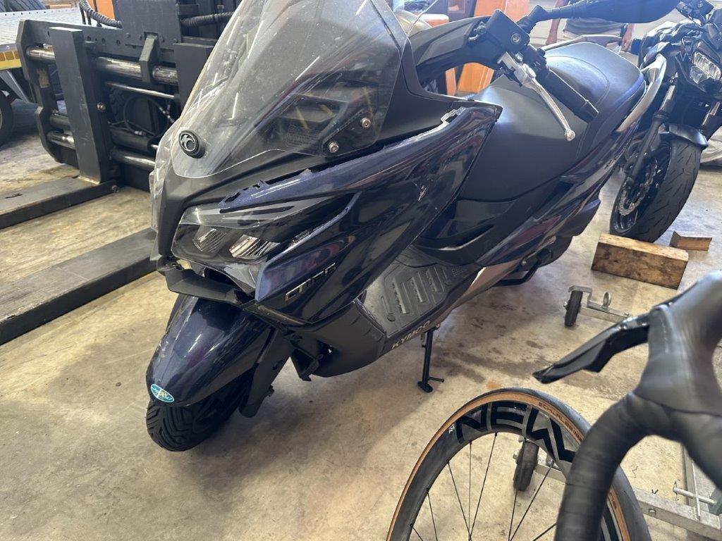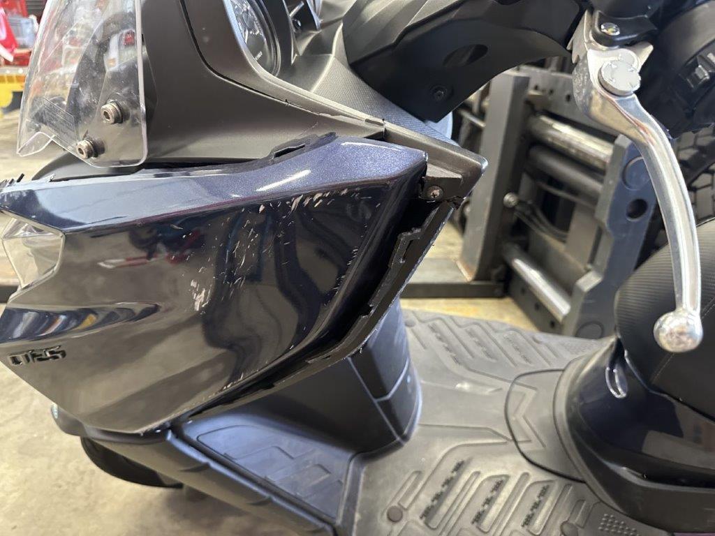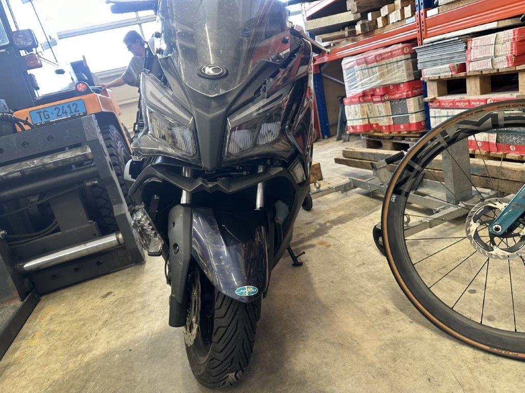 Anprall vorne. Dabei wurden das Rad vorne, die Gabel, das Schutzblech, der Scheinwerfer, alle Front- und Verkleidungen links sowie diverse Bauteile im Anprallbereich beschädigt