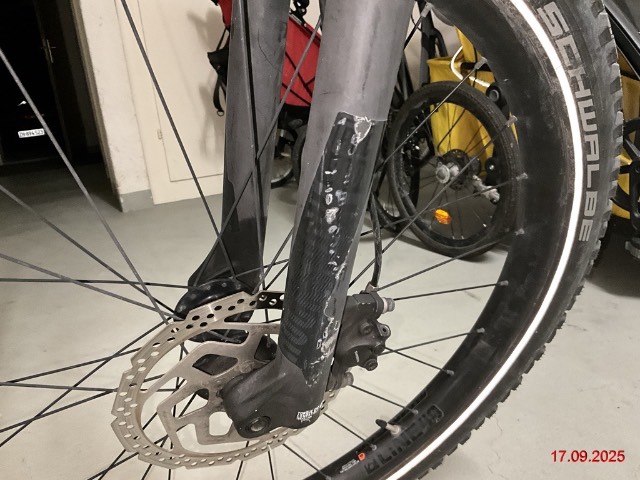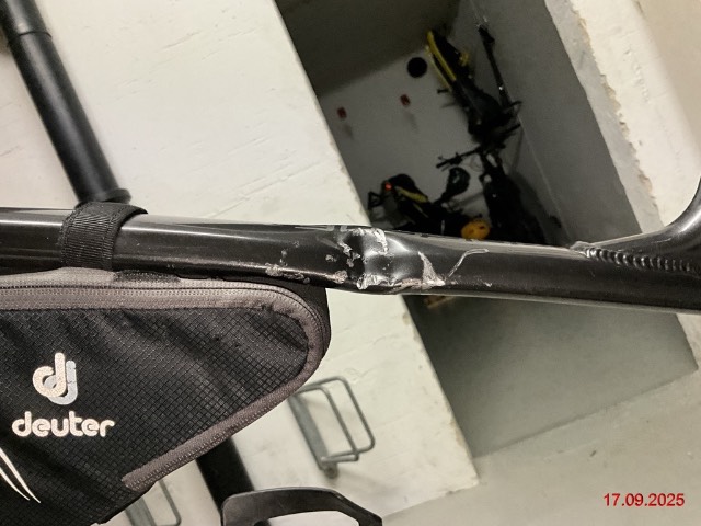 Beschreibung der Schäden: Oberrohr beschädigt. Rahmen verzogen. Vorbestandene Schäden: Gebrauchsspuren und Kratzer rundherum.
