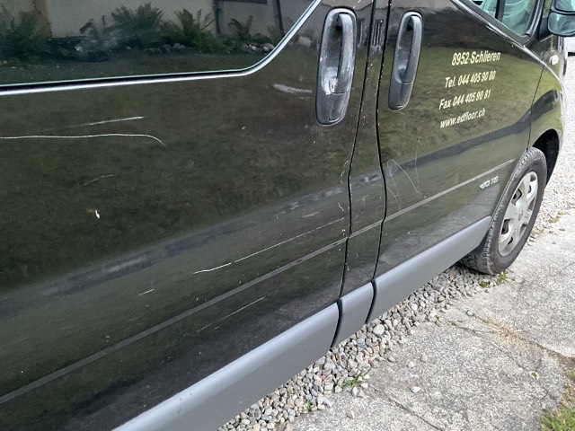 Beschreibung der Schäden: Heckblech Ecke Links und Seitenwand HL und H Mitte stark deformiert. Heckleuchte HR , Stossfänger HR, Seitenwand und Schiebetüre HR deformiert. Kühlwasserstand niedrig, Fehlerlampe Einspritzung defekt leuchtet auf, Motor läuft im LL Normal, zerstörtes Holzgestell bleibt im Fzg. Letzter Service Eintrag fehlt. Vorbestandene Schäden: Vorne rechts: Stossfänger Vorne links: Sitzkisssen defekt