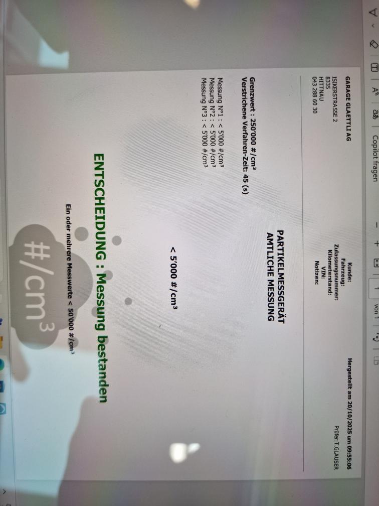 Dieselpartikelfiltertest wurde erfolgreich durchgeführt (Schriftlicher Ausdruck ist vorhanden).