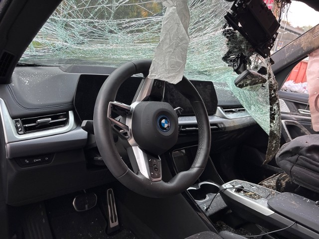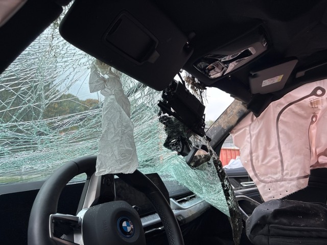 Windschutzscheibe ist gerissen. Heckscheibe ist zerbrochen / beschädigt. Türscheibe vorne rechts ist zerbrochen / beschädigt.