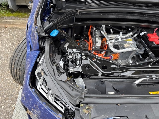 Front eingedrückt. Frontblech/Maskenblech eingedrückt. Radhaus vorne rechts und links eingedrückt. Längsträger vorne rechts und links gestaucht. Fahrzeugvorbau verschoben.