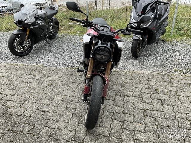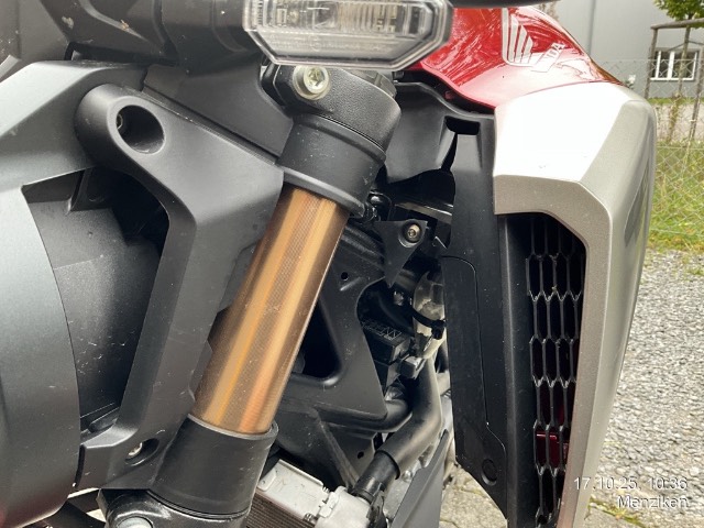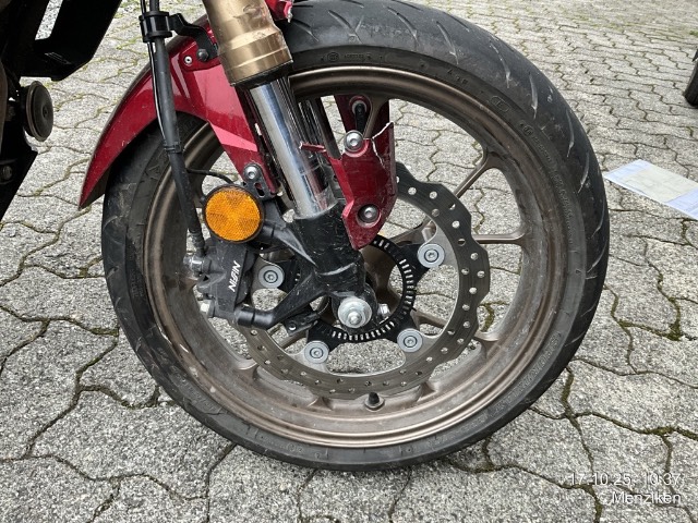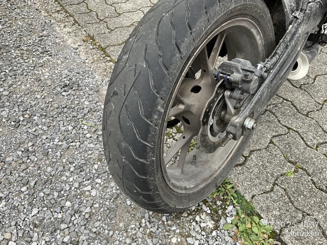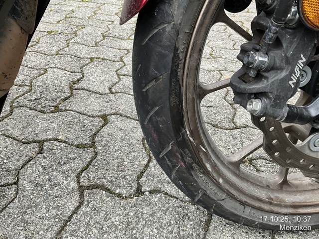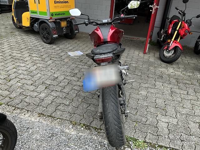 Beschreibung der Schäden: Frontschaden: Front eingedrückt, Vorderrad, Gabeln, Bremsscheibe, Lenker, Tankabdeckung, Seite links zerkratzt. Risiko Rahmen.