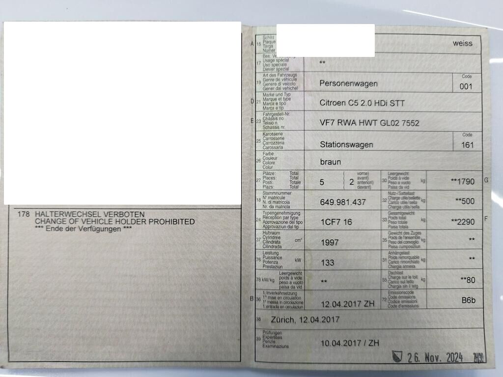 Die Stossstange hinten hat Kratzspuren und ist gerissen, diverse Anbauteile sind gerissen, die Türe vorne rechts hat Kratzspuren und eine Delle, die Türe hinten rechts ist deformiert, die Seitenwand hinten rechts hat Kratzspuren und eine Delle, die Schwellerverkleidung rechts hat Kratzspuren. Weitere Details zum Schadenfall gehen aus den beiliegenden Fotos hervor. Motor Getriebe Vorderachse Hinterachse Airbags ausgelöst: 0 unbekannt ( Abfallcode 16.01.04ak )