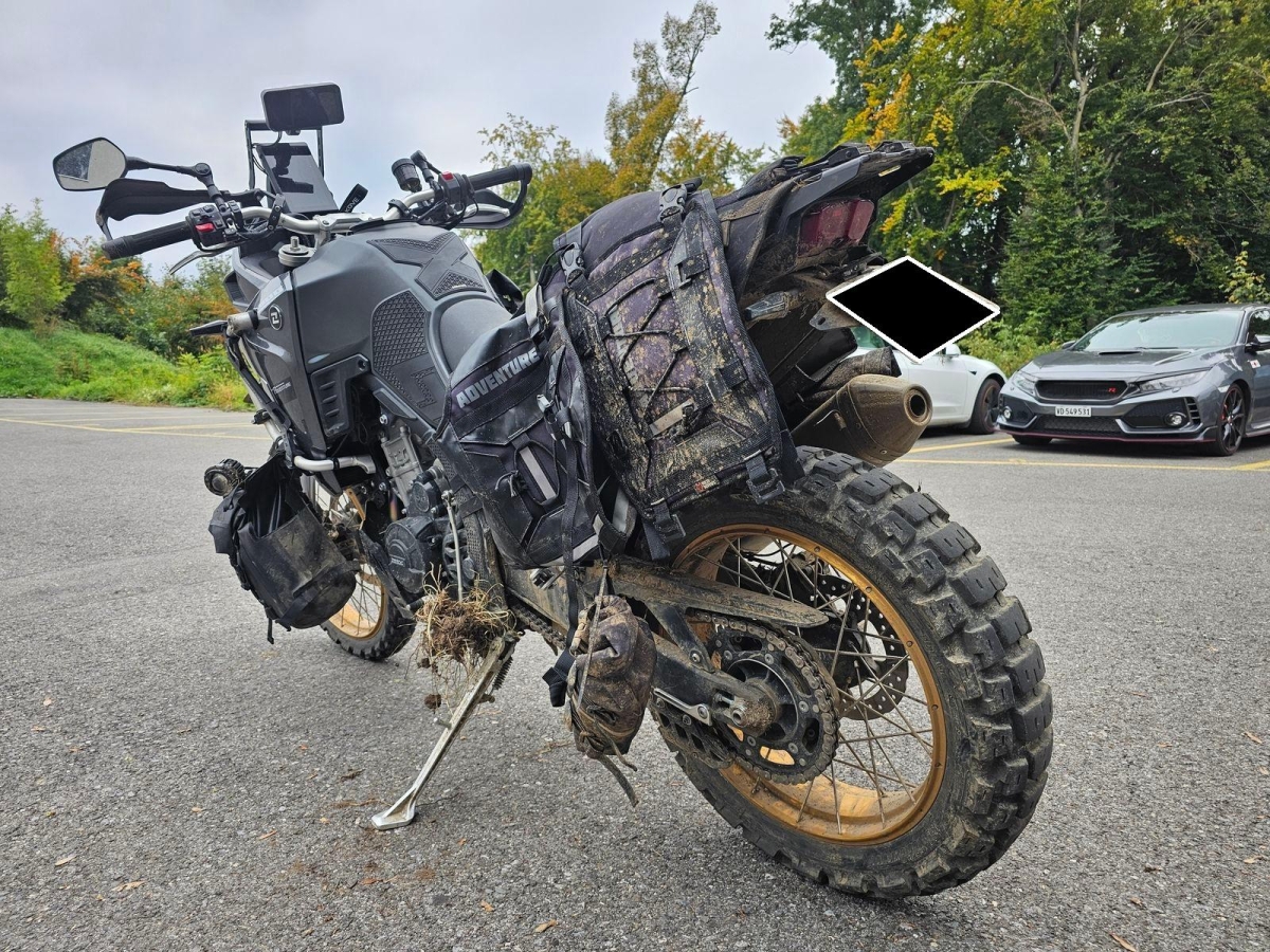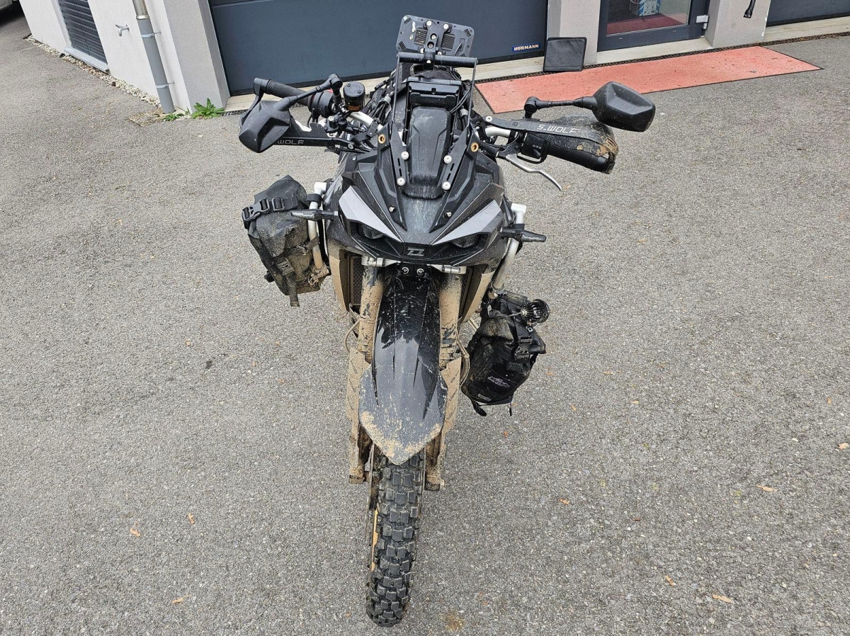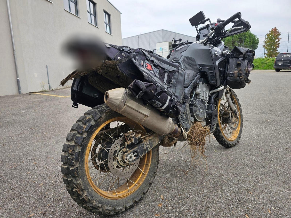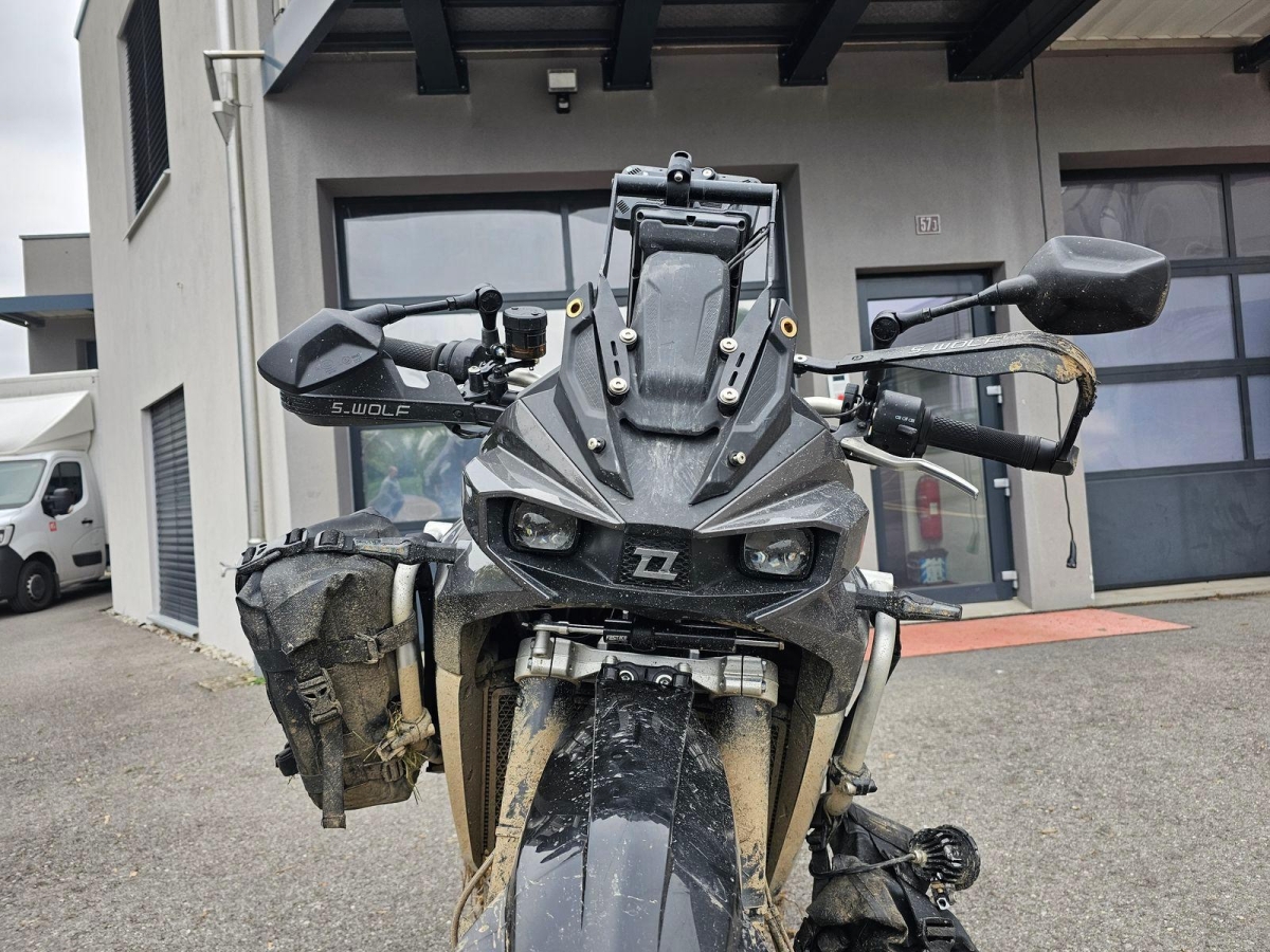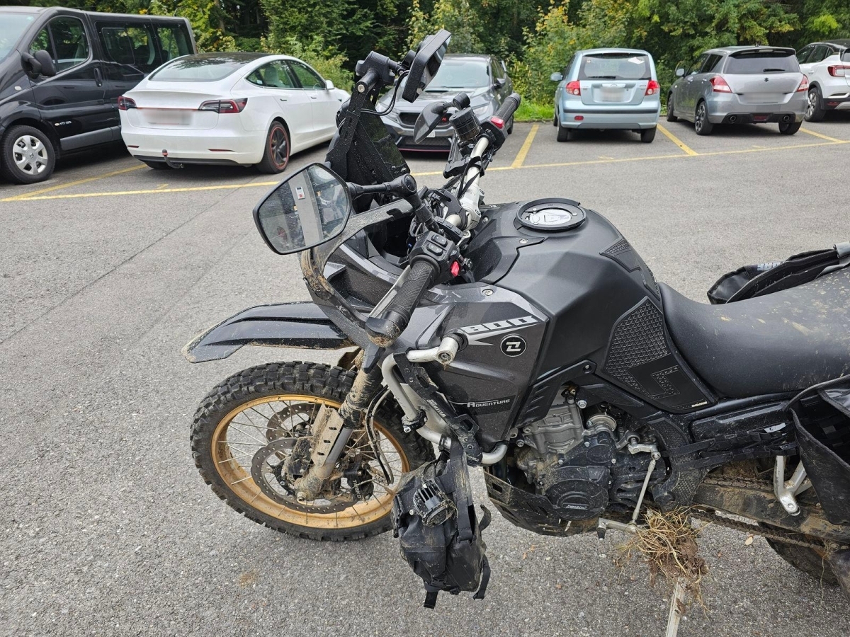 Chocs multiples avec sortie de route : pare-brise et supports, rétroviseurs, carénages avant et latéral gauche, phares additionnels, protecteurs de chute, sabot moteur, reposes-pieds avant et arrière gauche, sélecteur de vitesses et commande, échappement, cadre, bras-oscillant, guidon et pontets, protège main gauche, levier d'embrayage, support bagage arrière, etc... Réserves : fourche, Tés, etc...