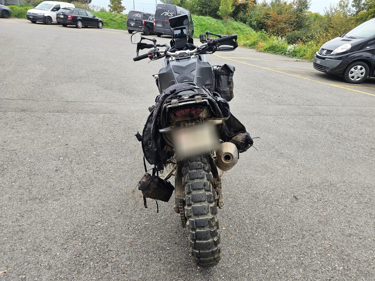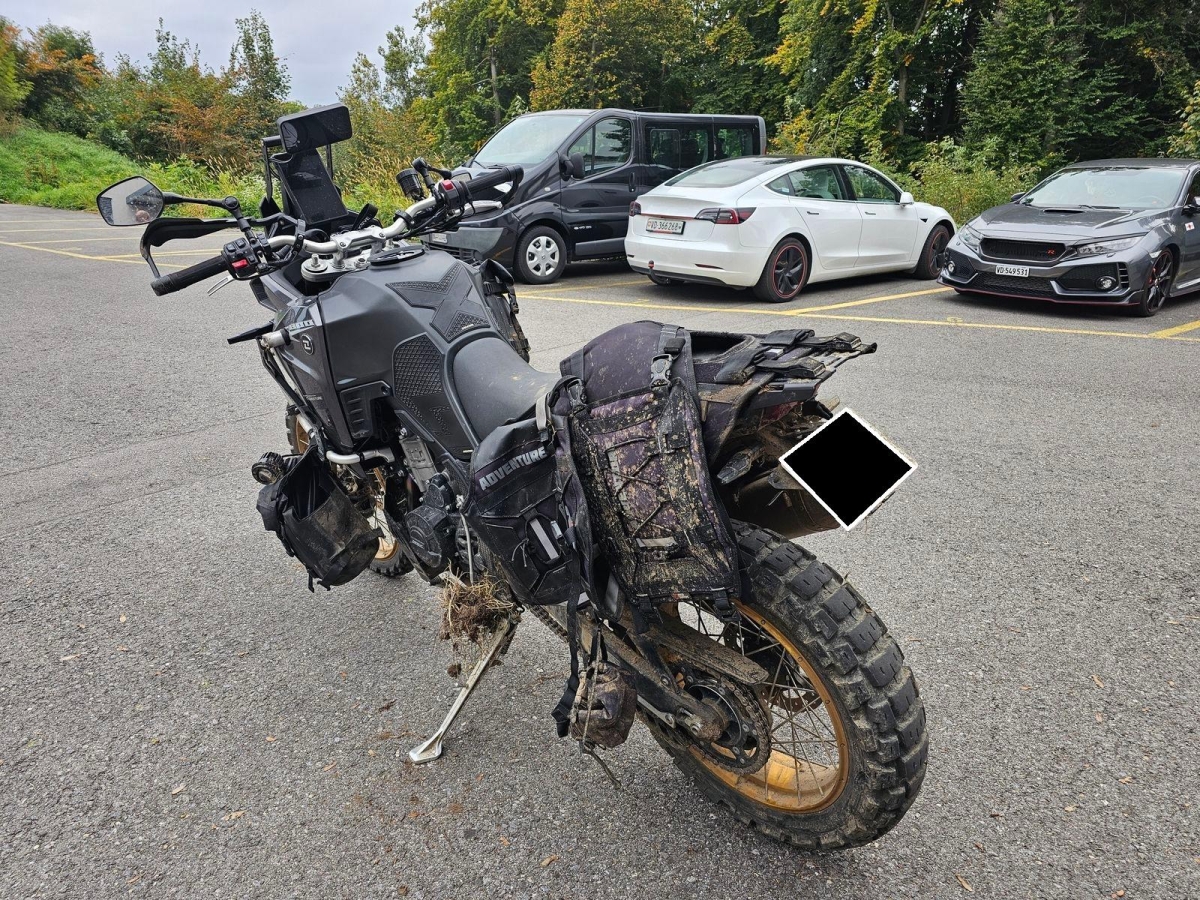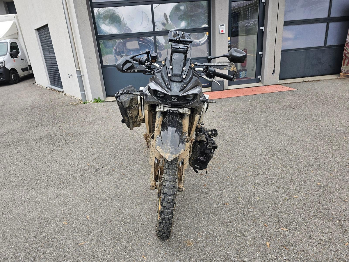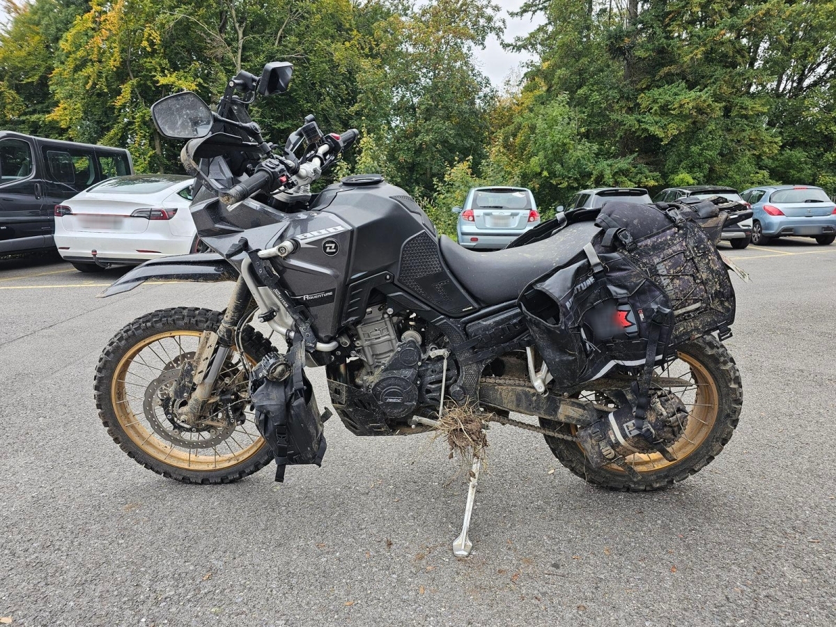 Chocs multiples avec sortie de route : pare-brise et supports, rétroviseurs, carénages avant et latéral gauche, phares additionnels, protecteurs de chute, sabot moteur, reposes-pieds avant et arrière gauche, sélecteur de vitesses et commande, échappement, cadre, bras-oscillant, guidon et pontets, protège main gauche, levier d'embrayage, support bagage arrière, etc... Réserves : fourche, Tés, etc...