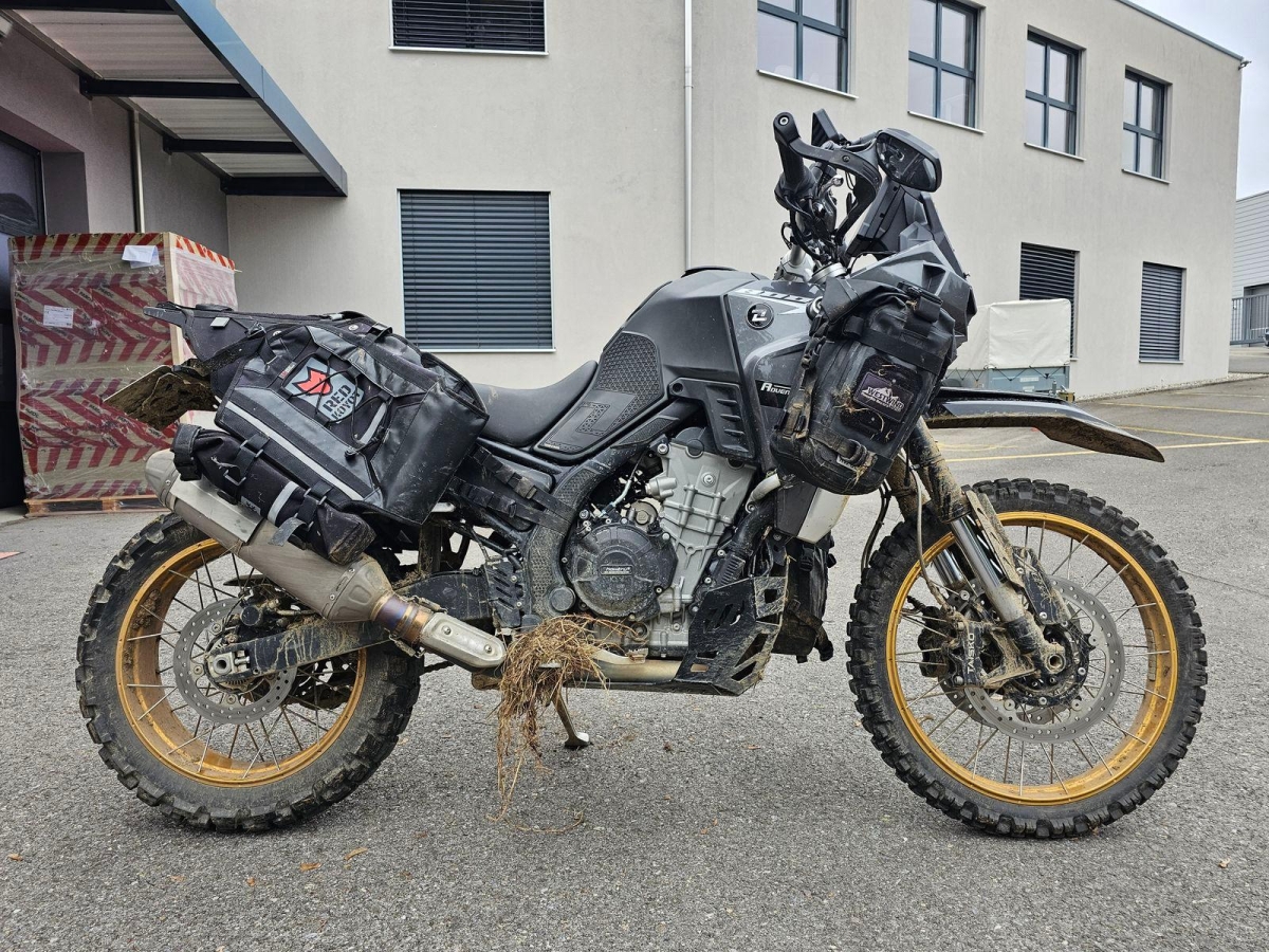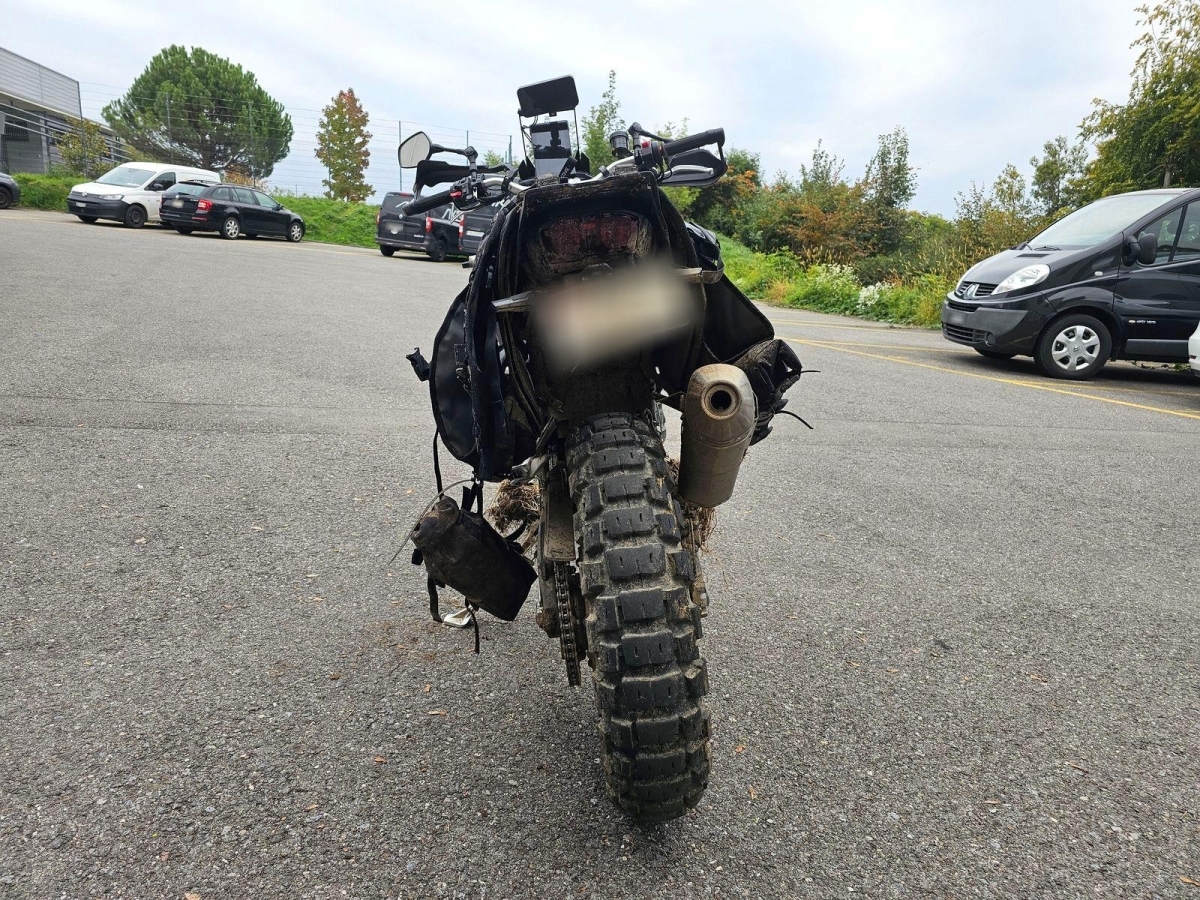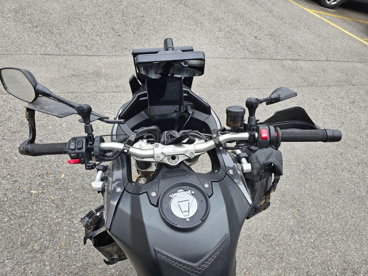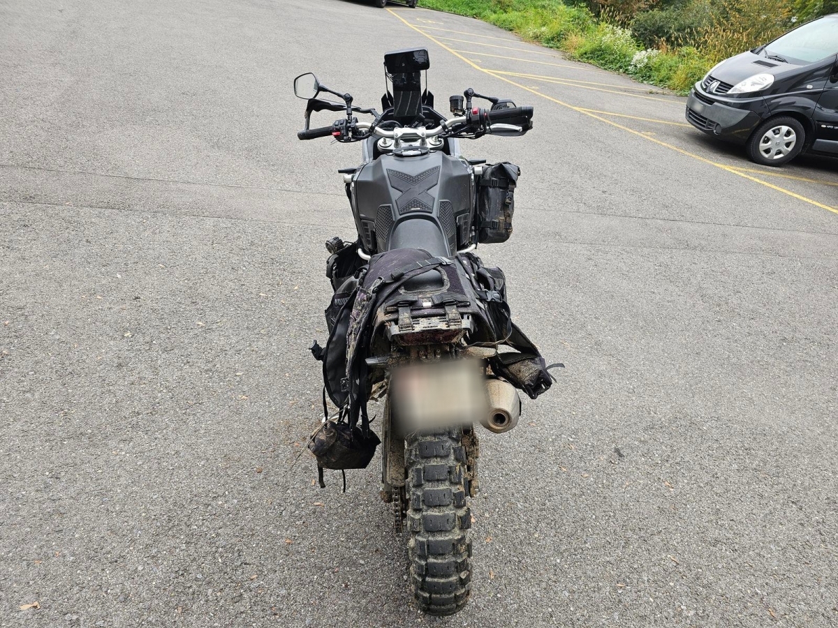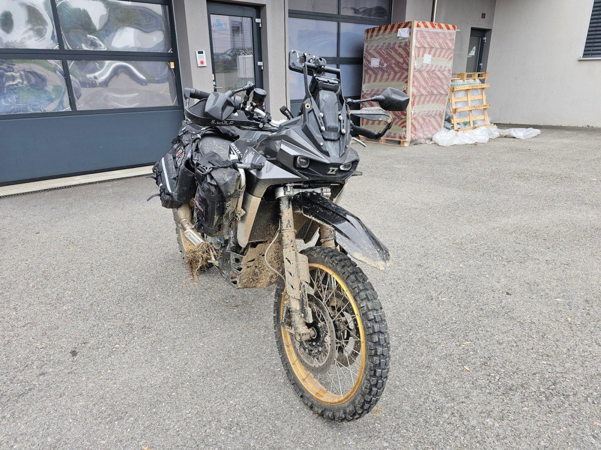 Chocs multiples avec sortie de route : pare-brise et supports, rétroviseurs, carénages avant et latéral gauche, phares additionnels, protecteurs de chute, sabot moteur, reposes-pieds avant et arrière gauche, sélecteur de vitesses et commande, échappement, cadre, bras-oscillant, guidon et pontets, protège main gauche, levier d'embrayage, support bagage arrière, etc... Réserves : fourche, Tés, etc...