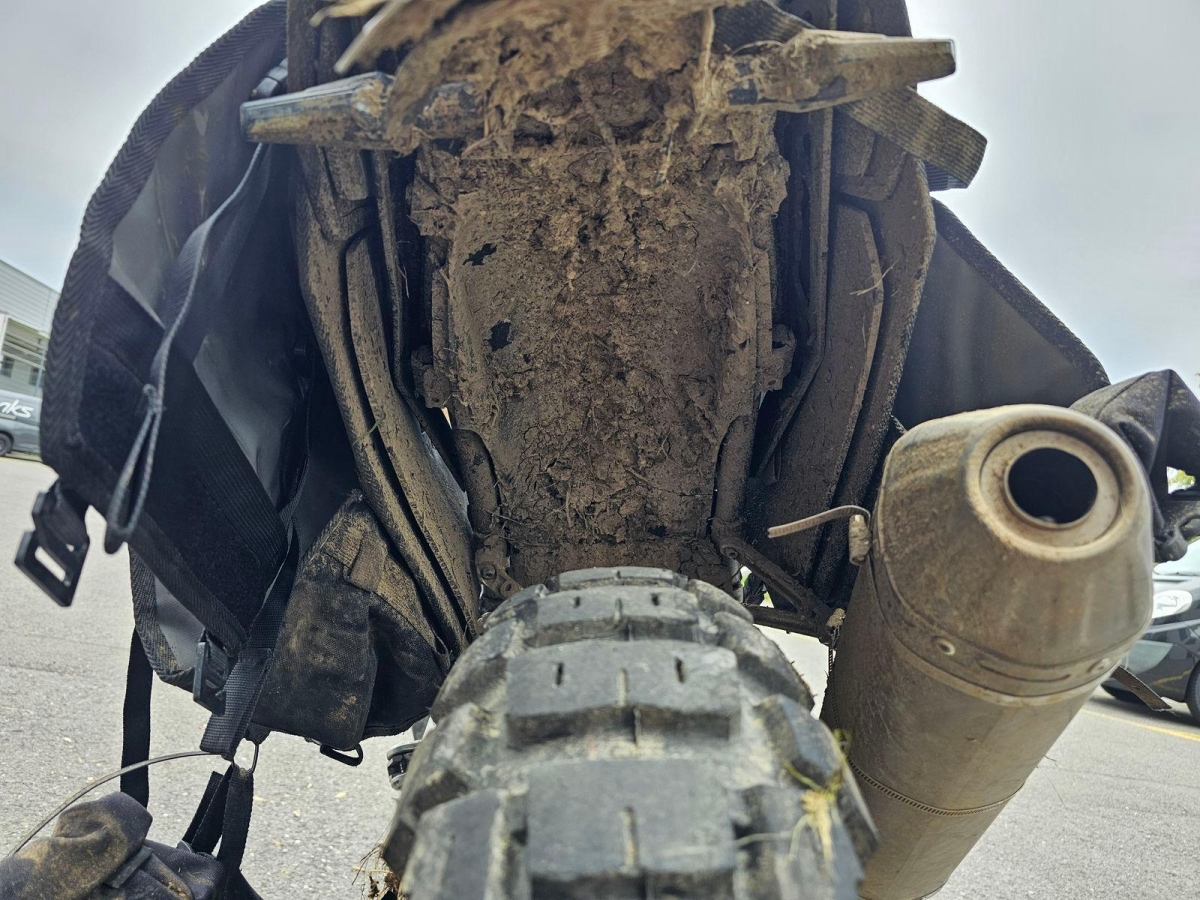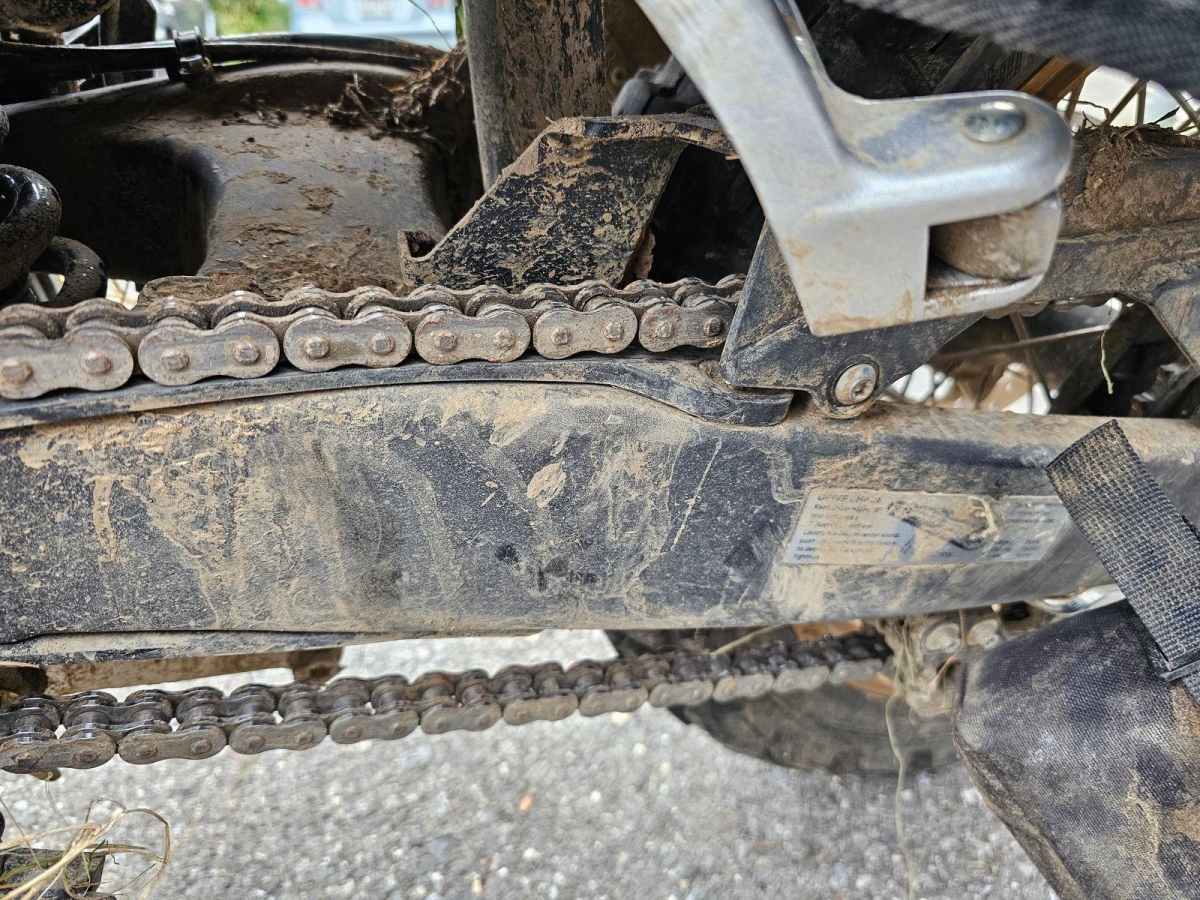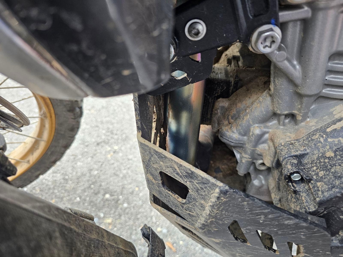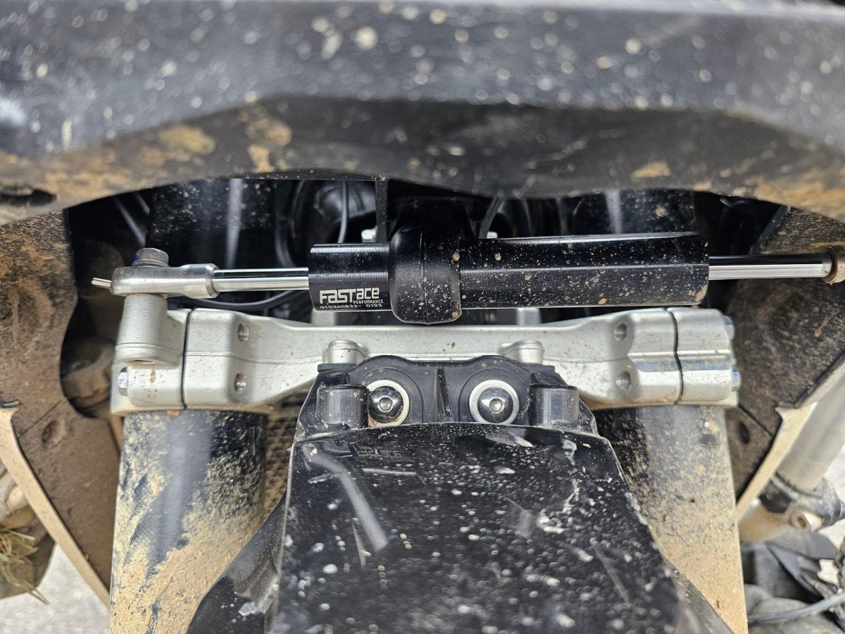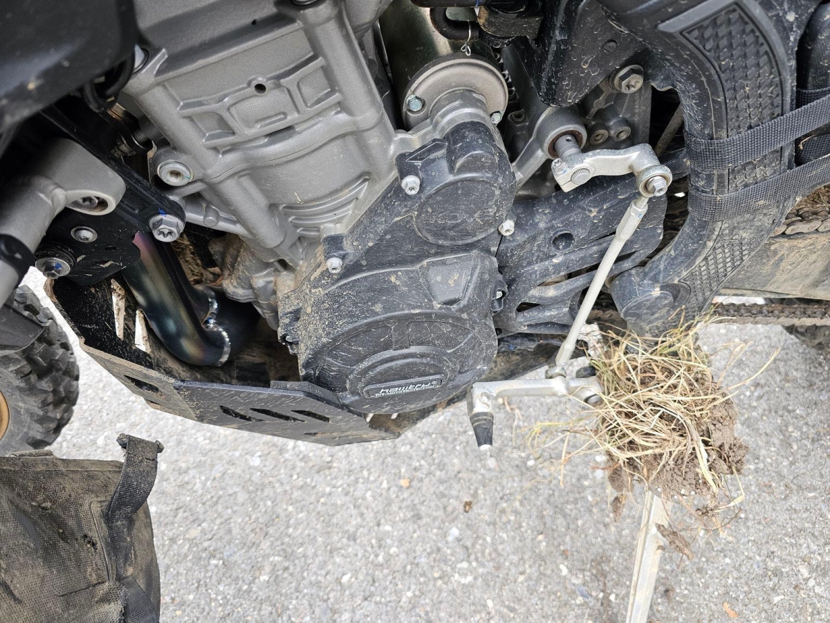Chocs multiples avec sortie de route : pare-brise et supports, rétroviseurs, carénages avant et latéral gauche, phares additionnels, protecteurs de chute, sabot moteur, reposes-pieds avant et arrière gauche, sélecteur de vitesses et commande, échappement, cadre, bras-oscillant, guidon et pontets, protège main gauche, levier d'embrayage, support bagage arrière, etc... Réserves : fourche, Tés, etc...