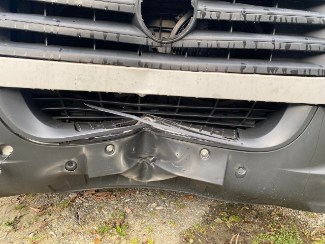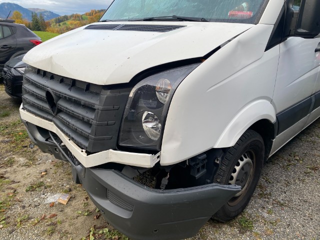 Front eingedrückt. Frontblech/Maskenblech eingedrückt. Längsträger vorne rechts gestaucht. Fahrzeugvorbau verschoben. Chassisvorbau deformiert.