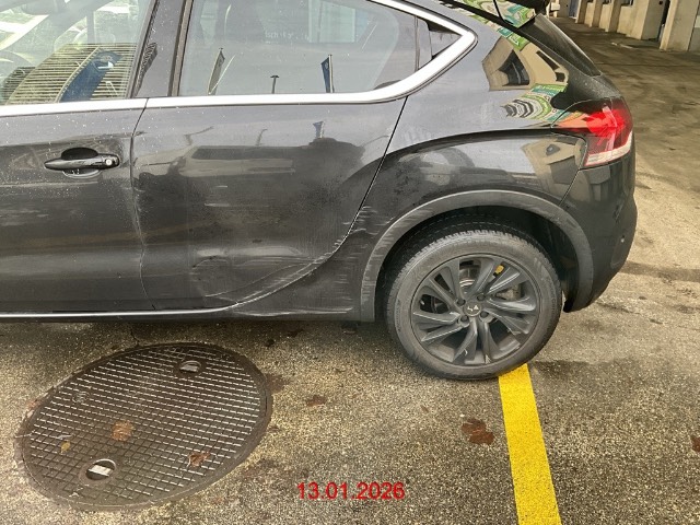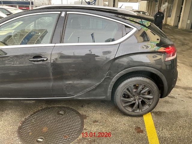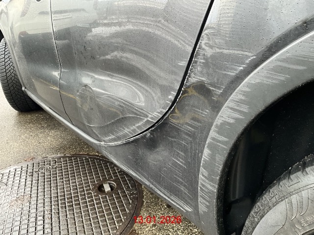 Seite hinten links: Türe und Seitenwand eingedrückt, Radlauf zerkratzt / Vorbestandene Schäden: Gebrauchsspuren