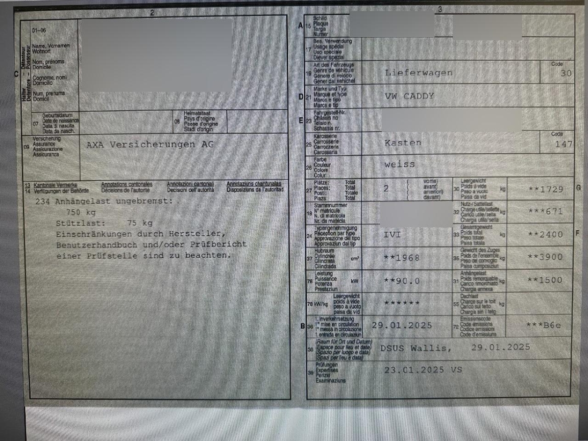 Elektrische Fensterheber, ESP, elektr. Stabilitätsprogramm mit ABS, EDS, ASR und MSR, Getriebe: 6-Gang-Getriebe manuell, Assist: Aufmerksamkeits- & Müdigkeitsassistent, Assist: Geschwindigkeitsregelanlage, Lackierung: Uni-Lackierung, Scheibenwischer mit Intervallschaltung und Waschdüsen, Heckscheibenheizung und -wischer, Zentralverriegelung mit Funkfernbedienung und Innenbetätigung, 8 Befestigungspunkte für Dachträger, Bordcomputer, Drehzahlmesser, Sitze: 2 Einzelsitze längsverstellbar im Fahrerhaus, Ohne Bodenbelag im Laderaum, Polster: Sitzbezüge in Stoff, Assist: Multifunktionskamera, Räder: 4 Stahlfelgen in schwarz 6.5 x 16 mit Reifen 205/60 R16, Stossstangen schwarz, Handschuhfach ohne Klappe und 2 Ablagefächer im Armaturenbrett, Garantie: 2 Jahre ohne Kilometerbegrenzung, Licht: Tagfahrlicht, Assist: Spurhalteassistent "Lane Assist", Türen: Heckflügeltüren mit Fenster, Wegfahrsperre, elektronisch, Lenkradsperre, Rollwiderstandsoptimierte Reifen, Media: 2 USB-C-Schnittstellen vorn (Leistung: 45W), Garantie: Garantie gegen Karosserie-Durchrostung: 12 Jahre, Assist: Einparkhilfe im Heckbereich, Assist: Notbremsassistent Front Assist mit Fussgänger- und Radfahrererkennung, Assist: Berganfahrassistent, Dachreling-Vorbereitung, Geschwindigkeitsabhängige Servolenkung, Licht: Leuchtweitenregulierung, 6 Verzurrösen im Laderaum, 2 Becherhalter in der Mittelkonsole, Bewegungsenergierückführung, Licht: Drittes Bremslicht, Motor-/Start-Stopp, Garantie: VW Anschlussgarantie (2+3 Jahre, max. 200'000km), Ablagefächer in den Fahrerhaustüren, Räder: Reifendruck-Kontrollanzeige, Media: Digitaler Radioempfang DAB+, Licht: Nebelschlussleuchte, Media: Digital Cockpit mit 10,25 Zoll-Farbdisplay, ohne Navigations-Informationen, Laderaumbeleuchtung, Kopfstützen vorne höhenverstellbar, Räder: Tire Mobility Set (Reifendichtmittel und 12 Volt Kompressor), Trennwand mit Fenster und Gitter, Airbag: Seiten- und Kopfairbags für Fahrer und Beifahrer, Höhenverstellbare 3-Punkt-Automatik-Sicherheitsgurte mit Gurtstraffer und höhenverstellbare Kopfstützen im Fahrerhaus, Wärmeschutzverglasung, Lenkrad: Multifunktionslenkrad, Garantie: Garantie gegen Lackmängel: 3 Jahre, Assist: Mit prädiktiven Speedlimiter (pLIM), Vorbereitung für Alkoholtester (Alcohol Interlock), Assist: Verkehrszeichenerkennung, Türen: Schiebetüre rechts im Lade-/Fahrgastraum, Airbag: Airbag für Fahrer und Beifahrer mit Beifahrer-Airbag-Deaktivierung, Sitze: Höheneinstellung für Fahrersitz, Elektrisch verstell- und beheizbare Aussenspiegel, Lenkrad: Lenksäule in Höhe und Länge verstellbar, Sicherheitsinnenspiegel, automatisch abblendbar, 4MOTION, Gummibodenbelag im Fahrgastraum