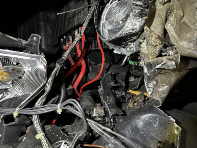 Front links eingedrückt. Kotflügel vorne links eingedrückt. Motorhaube eingedrückt. Frontblech/Maskenblech eingedrückt. Radhaus vorne links eingedrückt / gestaucht. Längsträger vorne links gestaucht. Fahrzeugvorbau verschoben.