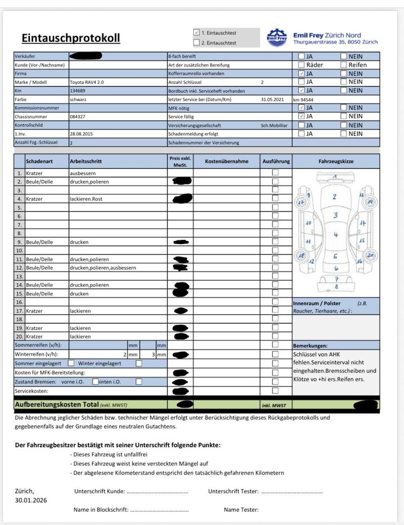 Keine Gewähr auf die Angaben der Sonder- und Serienausstattung / keine mechanische Prüfung. Fahrzeug wurde unzerlegt expertisiert / keine Haftung für allfällige, nach Demontage bekanntwerdenden Mängel. Fahrzeugbereifung und Ausstattung gemäss Fotos / Fahrzeugkauf auf eigenes Risiko ab Platz ohne Nachwährschaft. DPF/FAP Filter nicht kontrolliert.Keine technische Prüfung (Werkstatttest) vorgenommen. Fahrzeug ab Platz, ohne Garantie und Aufbereitung.- diverse Kratzer und Dellen am gesamten Fahrzeug- Schlüssel von AHK fehlt- Bremsscheiben und Klötzen vo+hi ersetzten- DAs Fahrzeug ist ein Hundeauto- Letzter Service 31.05.2021 bei 94544km