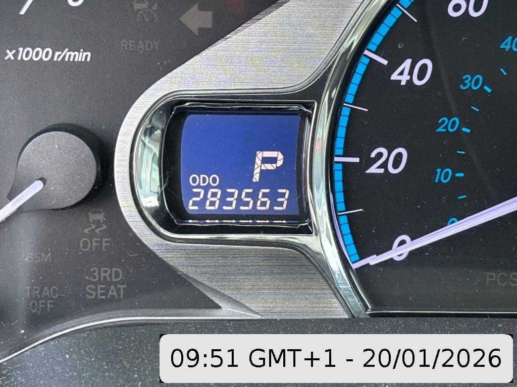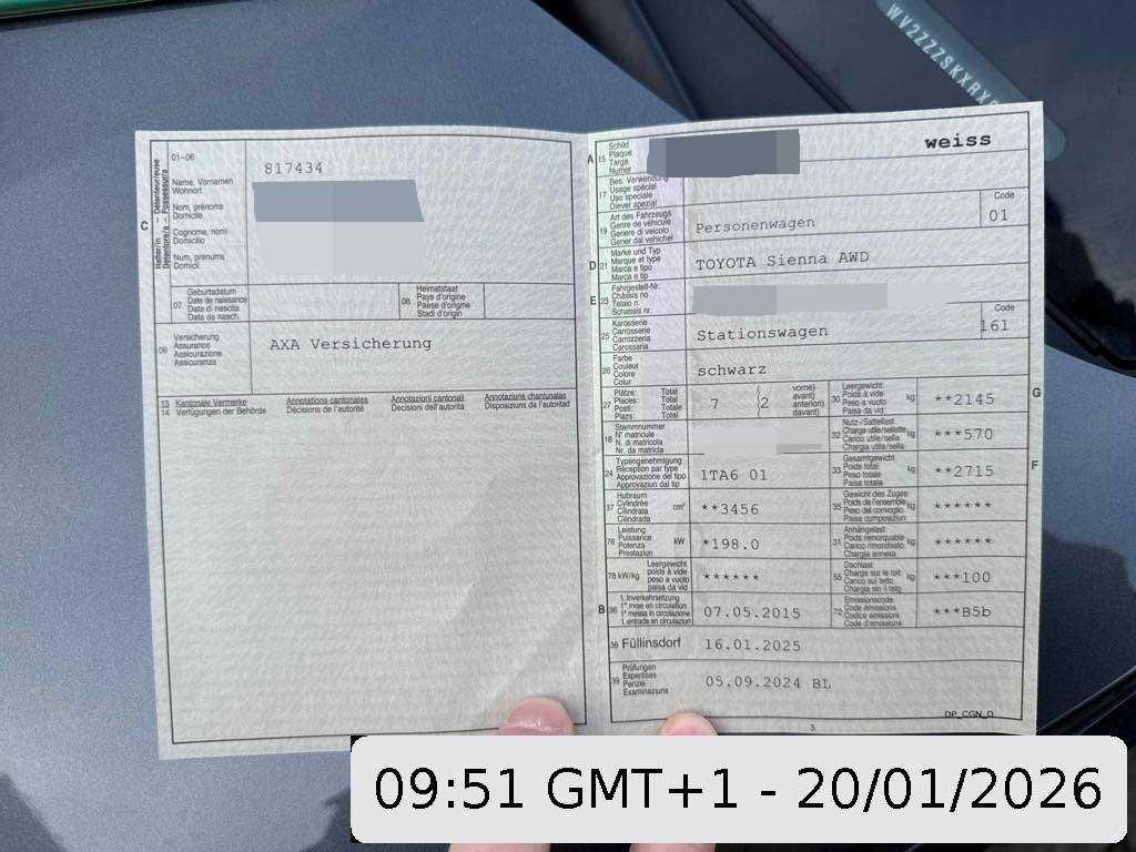 Abgedunkelte Seiten- und Heckscheibe, Licht: Nebelschlussleuchte, Schiebetüre rechts elektrisch, Airbag: Airbag Fahrer und Beifahrer, Wegfahrsperre elektronisch, Airbag: Knie-Airbag für Fahrer, Bremsassistent (BAS), 12-Volt-Steckdose vorne, Elektrische Fensterheber vorne + hinten, 2 Sitze mit Längsverstellung in der 2.Sitzreihe, Info-Display, Ausführung 7 Sitzplätze, BLIS (Blind Spot Information System), Lenkrad: Multifunktionslenkrad in Leder, Schiebetüre links elektrisch, Assist: Rückfahrkamera, Aktive Kopfstützen, Scheibenwischer vorne mit Intervall, Stabilitäts- und Traktionskontrolle (VSC und TRC), Pollenfilter (Staubfilter), Licht: Drittes Bremslicht, Airbag: Window-Kopfairbags, Sitze: Vordersitze elektrisch verstellbar, Dachspoiler, Assist: Tempomat, Allradantrieb permanent, Lenkrad: Lenkrad längs- und höhenverstellbar, Kopfstützen vorne höhenverstellbar, Aussenspiegel rechts und links beheizbar und elektrisch verstellbar, Aussentemperaturanzeige, Polster: Leder-Ausstattung, Airbag: Seitenairbag für Fahrer und Beifahrer, Armlehnen vorne, Diebstahlwarnanlage, Licht: LED-Tagfahrlicht, Tageskilometerzähler, Media: Bluetooth-Schnittstelle, Teppichfussmatten vorne und hinten, Automatisches Einschalten der Abblendlichter, Sitzbank in 3. Reihe geteilt umklappbar, Lackierung: Uni-Lackierung, Elektrische Heckklappe, Servolenkung, Katalysator geregelt, Sitze: Vordersitze heizbar, ISOFIX Kindersitzvorrichtung, Media: USB+AUX-Anschluss, Wärmeschutzverglasung, Seitenaufprall-Schutzsystem, Media: 6 Lautsprecher, Kopfstützen hinten höhenverstellbar, 12-Volt-Steckdose hinten, Innenspiegel automatisch abblendbar, Airbag: Airbag Beifahrer deaktivierbar, Stossstangen, Aussenspiegel und Türgriff in Wagenfarbe, Sonnenschutzrollos für Türscheiben hinten, Heckscheibenheizung, Dachreling Aluminium schwarz, 6-Stufen-Automat, Licht: Nebelscheinwerfer, Assist: Park Distance Control hinten, HomeLink Garagentoröffner, Räder: Reifendruck-Kontrollanzeige, Sitze: Kreuzstütze für Fahrersitz elektrisch verstellbar, ABS, EBD elektronische Bremskraftverteilung, Getönte Scheiben, Digital Uhr, Zentralverriegelung mit Fernbedienung und automatischer Türverriegelung, Klima: 3-Zonen-Klimatisierungsautomatik, Elektrisches Glasschiebe- / Hebedach, Holzapplikationen, Cupholder, Media: Navigationssystem Toyota Touch&Go, Leichtmetallräder im 10-Speichen-Design 18J