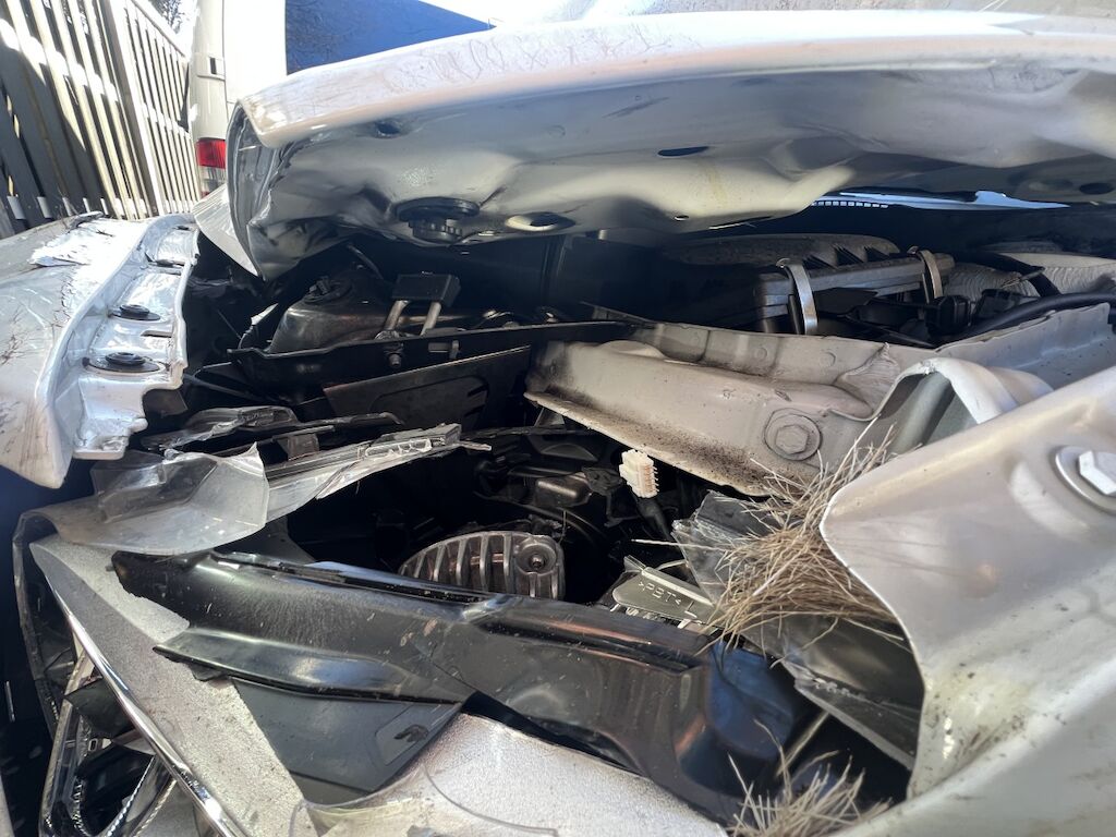 Front mit Anbauteilen eingedrückt und aufgestaucht. Scheinwerfer und div. Anbauteile gebrochen. Frontträger und Frontmaske nach innen gedrückt. Div. Luftführungen, Kondensator, Kühler, Lüfter, Luftfiltergehäuse, etc. beschädigt. Beide Kotflügel def. Türe und A-Spiegel v.l. beschädigt. Motor läuft, hat aber Kontakt mit Fremdteilen. Kl. Risiko. Motor Getriebe Vorderachse Hinterachse Airbags ausgelöst: 0 unbekannt ( Abfallcode 16.01.04ak )