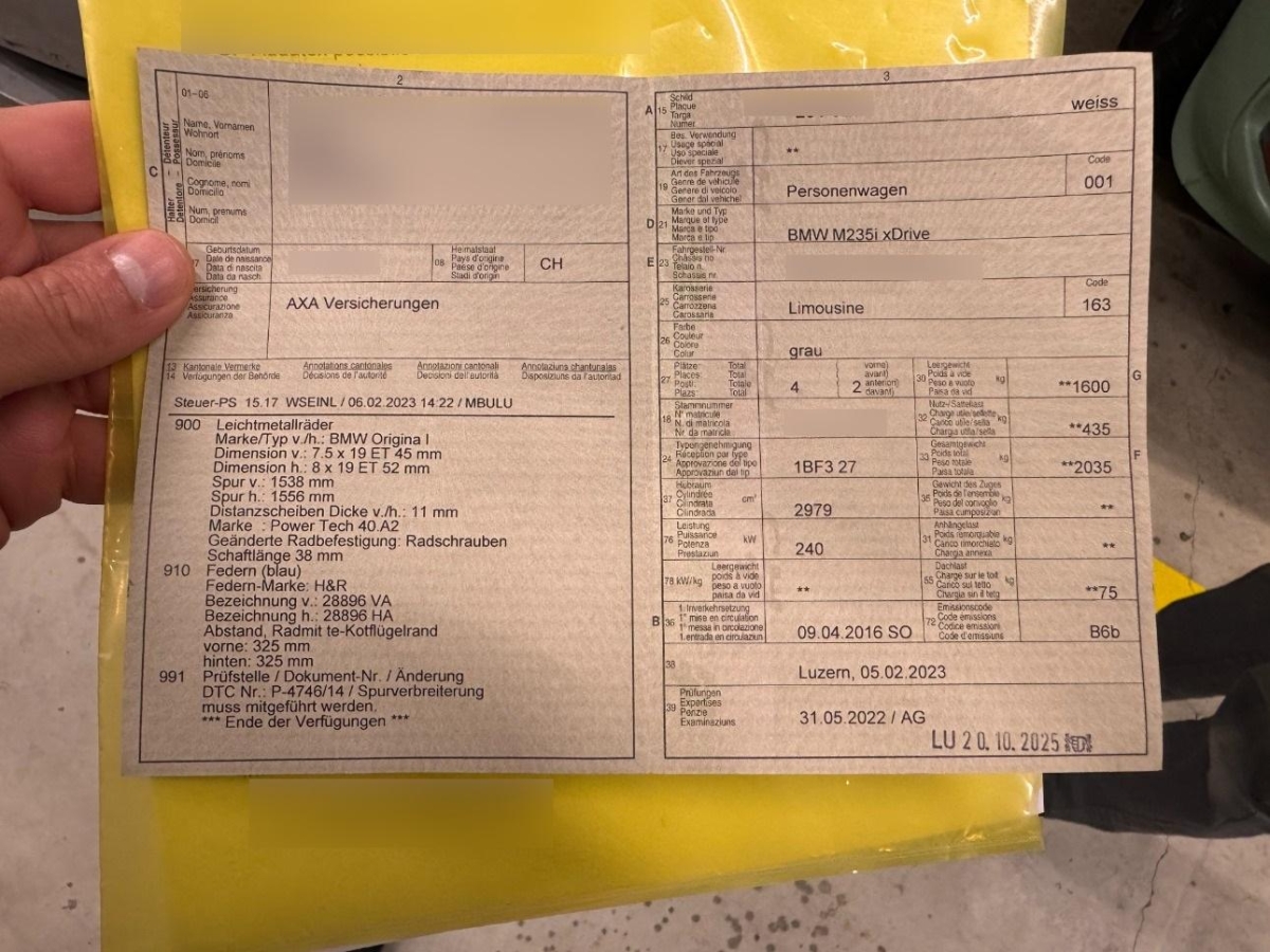 Zusatzausstattung:H&R Tieferlegungsfedern (Im Fahrzeugausweis eingetragen)M Performance SportlenkradM Performance Sportauspuff8-Fach Alubereift (Sommer/Winter)Carbon SpiegelabdeckungenHeckspoilerDie (vom Fahrzeugexperten) ermittelten Reparaturkosten beziehen sich auf das versicherte Ereignis. Allfällige zusätzliche, nicht versicherte Schäden/Vorschäden, sind in den Reparaturkosten nicht enthalten. Die deklarierten Ausstattungsmerkmale können von der effektiven Ausstattung abweichen.AchtungBei einem Hochvoltsystem - Spannungsfreiheit prüfen. Sicherheitshinweise und Betriebsanleitungen des Herstellers konsultieren und befolgen.Das Fahrzeug steht beim nachfolgend aufgeführten Standortbetrieb und muss vor Gebotsabgabe besichtigt werden.Bitte melden Sie Ihren Besuch beim Standortbetrieb telefonisch an:Autoverwertung Müller AGLuzernerstrasse 406144 Zell LU041 988 19 87