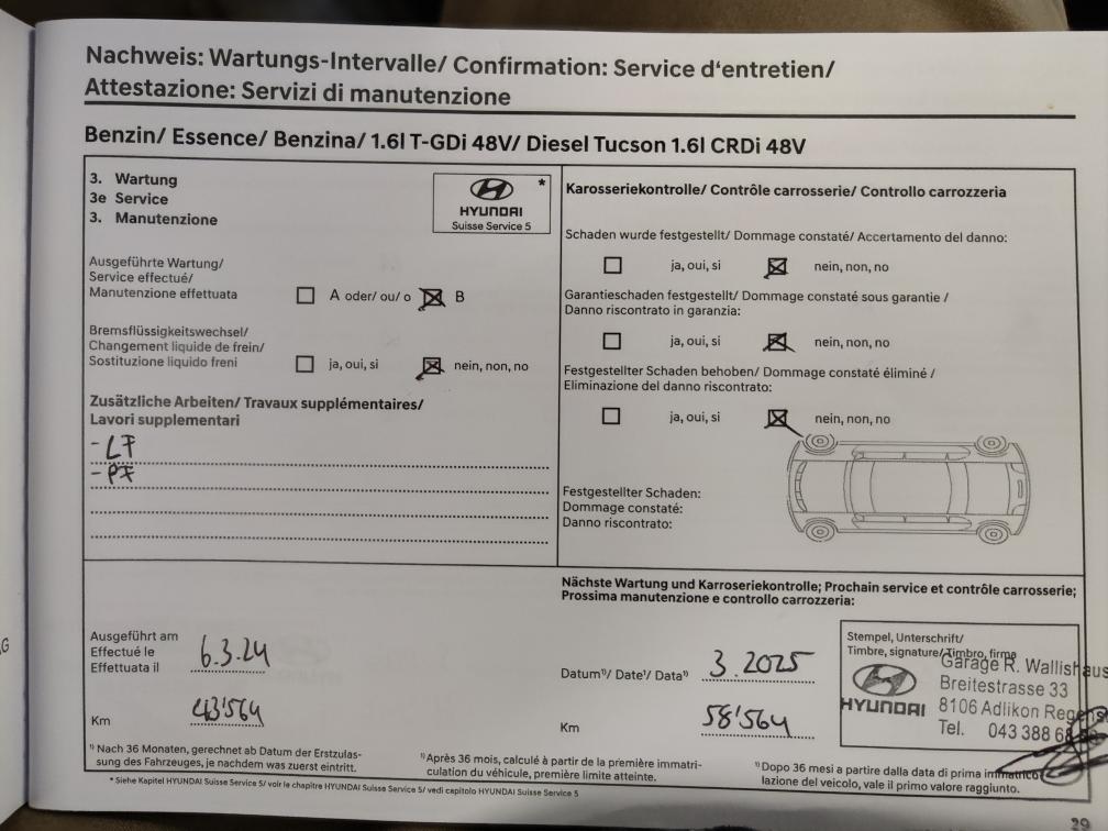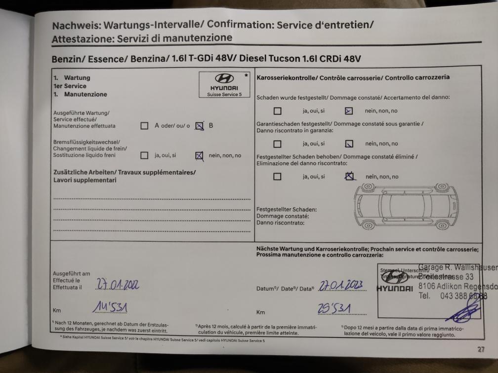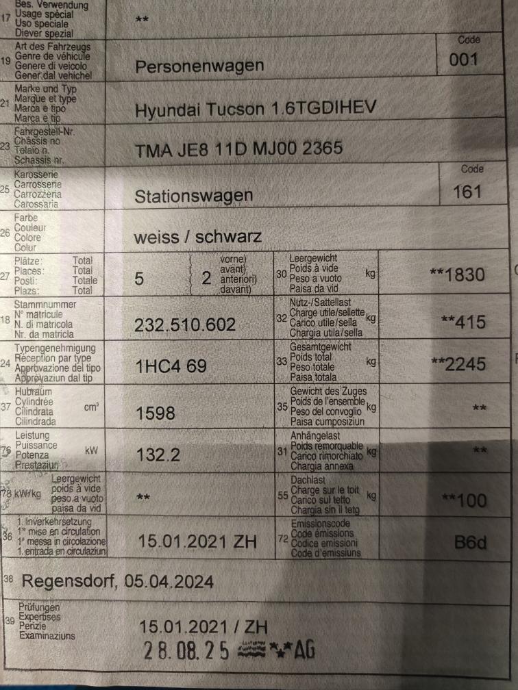 Hyundai Tucson 1.6 T-GDi HEV Vertex 4x4 (Vollhybrid - kein Mild Hybrid) ! sehr gepflegter Wagen in Top Zustand ! Aus 1. Hand, kein Raucherauto, kein Hundeauto Garantiert Unfallfrei Vollausstattung VERTEX (Schweizer Fahrzeug - kein Direktimport) !!! Frisch ab MFK : 28.08.2025 !!! !!! Letzter Service 17.03.2025 !!! 1. Inv.: 15.01.2021 Kilometerstand: 61'950Km Zubehör: 8fach bereift (Kompletträder Original Hyundai Aluminiumfelgen Sommer Profiltiefe 4mm / Winter Profiltiefe 5mm) Garantie: Hochvoltbatterie: 8 Jahre oder 160’000 Kilometer ab 1. Inv.: 01.2021 Sehr gerne geben wir Ihnen persönlich per Email, telefonisch oder persönlich vor Ort genauere Auskünfte zum Zustand der Fahrzeuge. Während der laufenden Auktion können die Fahrzeuge, nach Voranmeldung, besichtigt und zur Probe gefahren werden! Jede Gewährleistung, soweit nach schweizerischem Obligationenrecht (OR) möglich, ist wegbedungen, insbesondere sind Wandelung und Minderung ausgeschlossen. Nach Abschluss der Auktion keine Preisverhandlungen, keine Diskussion betreffend Zustand, Geräusche oder weitere Punkte. Das Fahrzeug kann diverse Gebrauchsspuren aufweisen, wie Dellen, Kratzer, Beulen, Beschädigungen (aussen und innen). Es existiert keine explizite Zustandsbeschreibung. S e r i e n a u s s t a t t u n g (gemäss Auto-I Dat Vin Abfrage): Smart Key + Startknopf, Start + Stopp Automatik, Elektrische Fensterheber vorne + hinten, Aussenspiegel elektrisch einklappbar, Aussenspiegel elektrisch verstellbar und heizbar, Regensensor, Heckklappe elektrisch mit Freihandfunktion, Privacy-Verglasung, Dachreling, Leichtmetallfelgen 19", Reifen-Reparatur Set, Servolenkung geschwindigkeitsabhängig, Fahrwerk elektronisch geregelt, Ottopartikelfilter, Airbag Fahrer und Beifahrerseite, Deaktivierung Beifahrerairbag, Center Airbag vorne, Seitenairbags vorne, Vorhangairbags vorne + hinten, Fernlichtassistent, Spurhalteassistent LDW, Ausstiegs-Assistent, Insassen-Alarm, Verkehrszeichenerkennung & Geschwindigkeitsbegrenzer, Automatische Notbremsung, Müdigkeitserkennung, Stauassistent, Autobahn-Assistenzsystem, Spurverfolgungsassistent, Totwinkel-Assistent mit Video, Querverkehrswarnassistent, Alarmanlage, Isofix-Kindersitzbefestigung, Automatische Distanzregelung ACC, Einparkhilfe vorne, Einparkhilfe hinten, Ferngesteuertes Parken, Rückfahrkamera, 360° Kamera, Reifendruck-Kontrollsystem RDK, Berganfahr- Bergabfahrassistent, Notrufassistent, LED Tagfahrlicht, Statisches Kurvenlicht, LED-Scheinwerfer, LED Rückleuchten, ABS und EBV Elektr. Bremskraftverteilung, ESP Elektronisches Stabilitätsprogramm, Drei Zonen-Klimaautomatik, Lenkrad beheizbar, Lederlenkrad mit Lederschaltknauf, Lederinterieur, Aktive Sitzbelüftung vorn, Vordersitze höhenverstellbar, Sitzheizung vorne, Sitzheizung hinten, Rücksitze geteilt umklappbar 40/20/40, Elektrisch verstellbare Vordersitze, Automatisch abblendbarer Innenspiegel, Ambientebeleuchtung, Gepäcknetz, Premium-Soundsystem, Radio/ USB/ DAB+, Audiofernbedienung am Lenkrad, Bluetooth Freisprecheinrichtung, Navigationssystem, Kartenupdate MapCare, Apple Car Play/ Android Auto, Wireless Charging für mobile Geräte