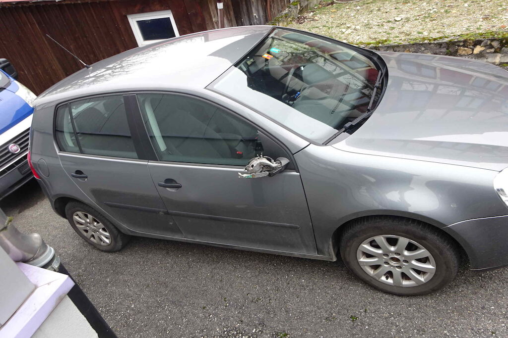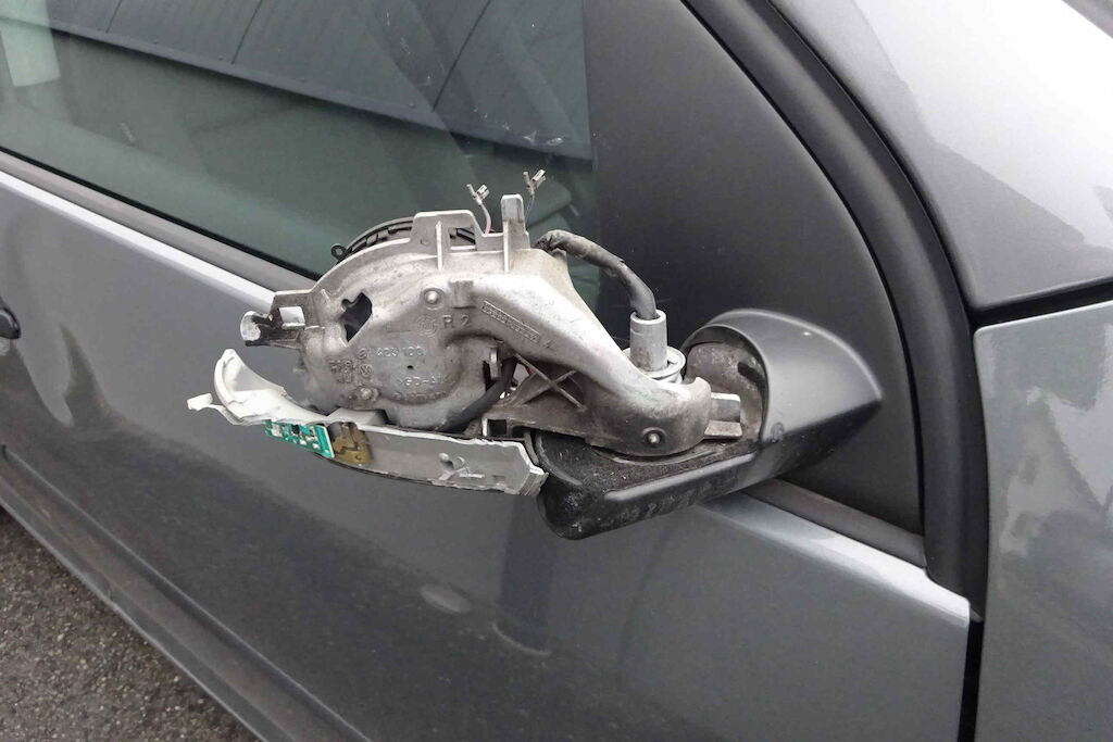 Seitenspiegel, Türe, Fensterscheibe und Seitenwand beschädigt Motor Getriebe Vorderachse Hinterachse Airbags ausgelöst: 0 unbekannt ( Abfallcode 16.01.04ak )