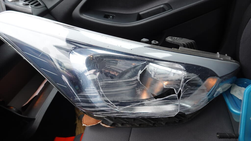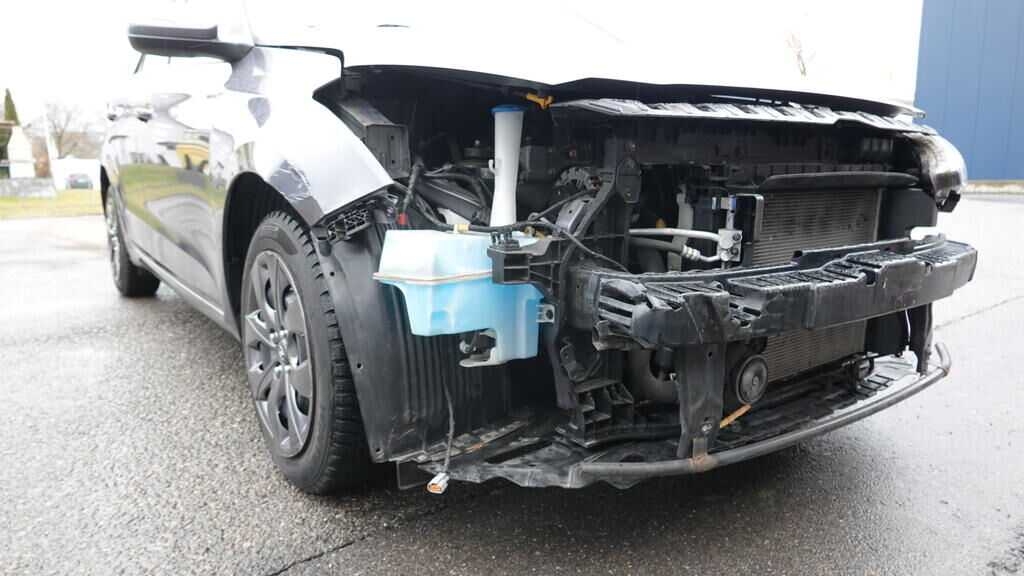 Stossstangenabdeckung und Zierelemente gerissen. Scheinwerferglas gerissen. Kotflügel eingedellt und aufgestaucht, Einstiegsschwelle rechts verformt. Unter der demontierten Stossstangenabdeckung kann erkannt werden, das auch der Stossstangenträger und die Radhausschale im Anstossbereich beschädigt wurden. Kollisionskontaktspuren am Rad vorne rechts auszumachen. Motor Getriebe Vorderachse Hinterachse Airbags ausgelöst: 0 Nein ( Abfallcode 16.01.04ak )