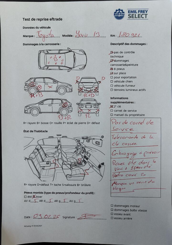 Pas de contrôle technique (essai en atelier) effectué Dommages divers à la carrosserie/à la peinture. Huit pneus. Pas de carnet de service. Pas de manuel d'utilisateur. Télécommande de la clé cassée. Remplacement embrayage à prévoir. Rétroviseurs extérieurs cassés. Manque un vérins sur le hayon. Véhicule dès site, sans garantie et sans préparation. Motor Getriebe Vorderachse Hinterachse Airbags ausgelöst: 0 Nein ( Abfallcode 16.01.04ak )