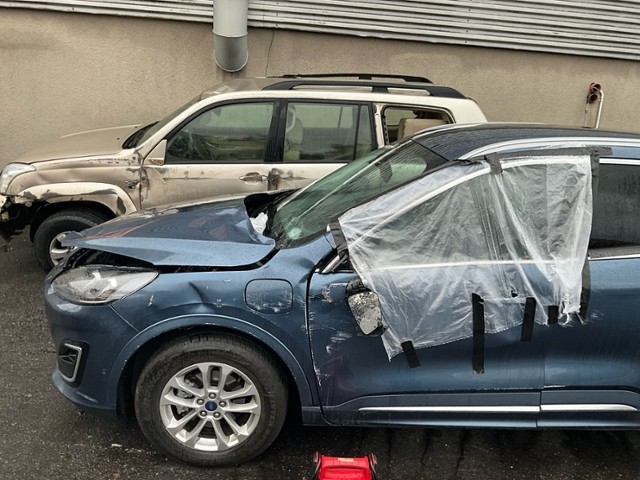 Windschutzscheibe ist gerissen. Türscheibe vorne links ist zerbrochen / beschädigt. Türscheibe hinten rechts ist zerbrochen / beschädigt.