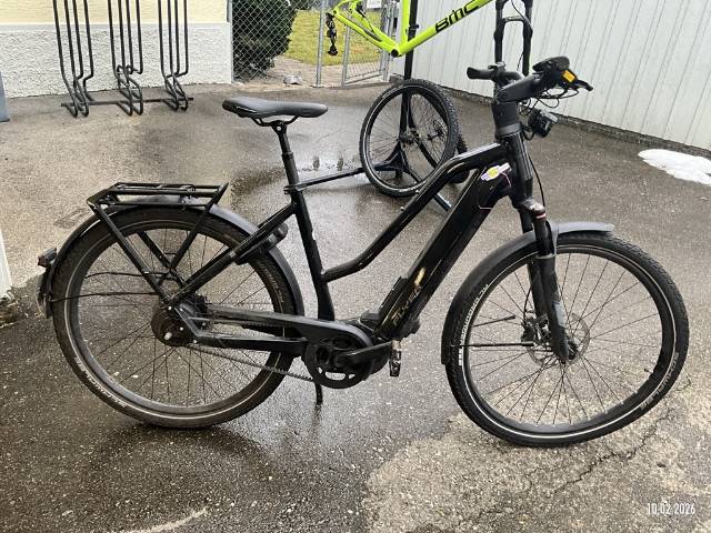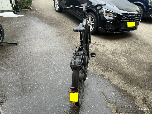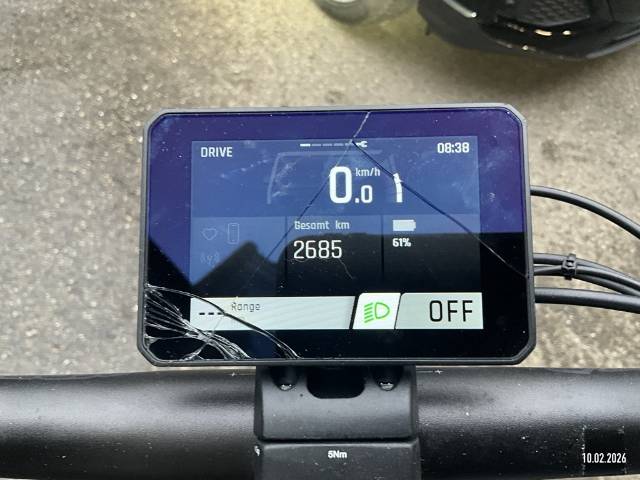 Display beschädigt, Gabel vorne verzogen, Rahmen verzogen, Felge vorne verzogen, Rückspiegel abgerissen, Schutzblech hinten verzogen, Gepäckträger zerkratzt - AUFZÄHLUNG NICHT ABSCHLIESSEND / Vorbestandene Schäden: Gebrauchsspuren