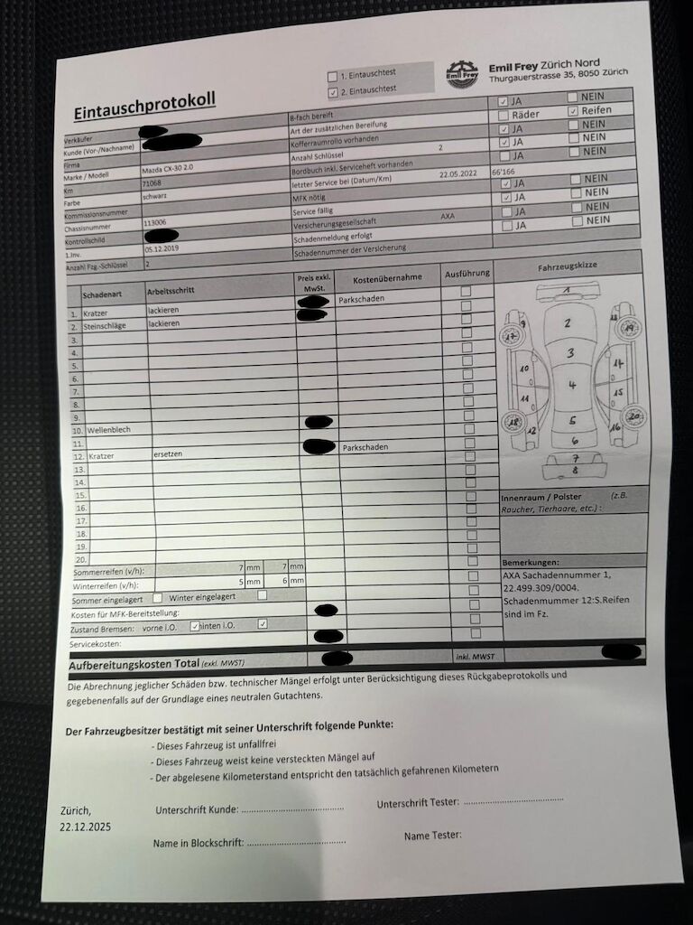 Keine technische Prüfung (Werkstatttest) vorgenommenDiverse Schäden an Karosserie/Lack.Fahrzeug ab Platz, ohne Garantie und Aufbereitung.DPF/FAP Filter nicht kontrolliertKeine Gewähr auf die Angaben der Sonder- und Serienausstattung / keine mechanische Prüfung. Fahrzeug wurde unzerlegt expertisiert / keine Haftung für allfällige, nach Demontage bekanntwerdenden Mängel. Fahrzeugbereifung und Ausstattung gemäss Fotos / Fahrzeugkauf auf eigenes Risiko ab Platz ohne Nachwährschaft.- Div. Kratzer am gesamten Fahrzeug.- Div. Steinschläge am Frontscheibe- Stossstange hinten Parkschaden- Letzter Service am 22.05.2022 bei 66166 km