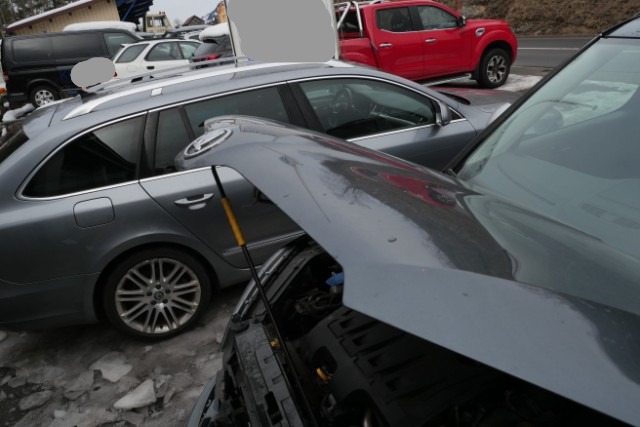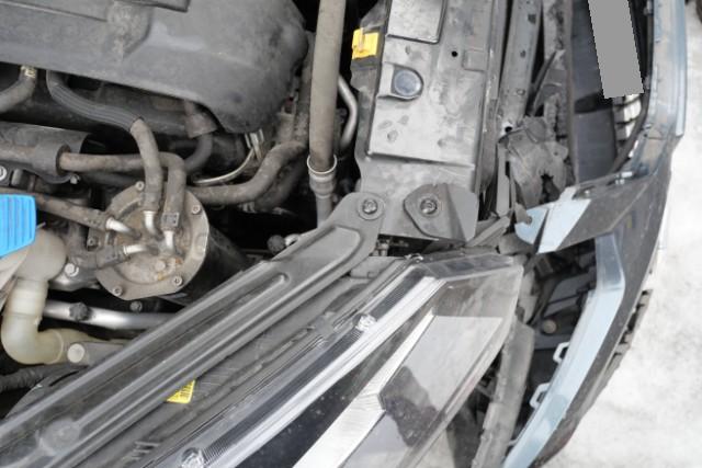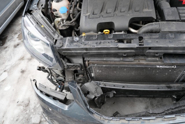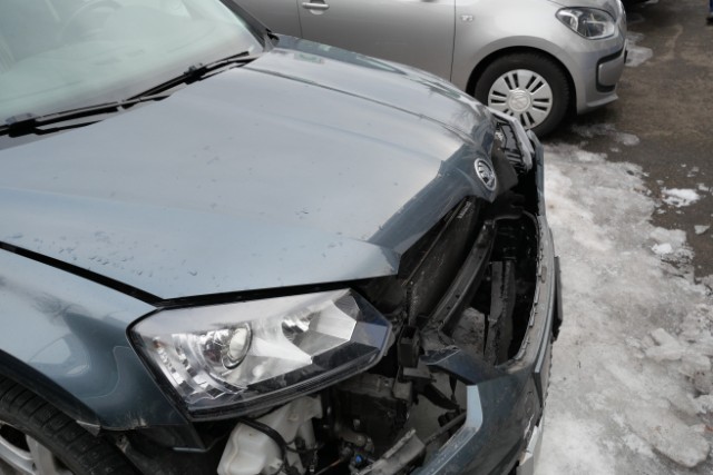 Front eingedrückt. Front rechts eingedrückt. Frontblech/Maskenblech eingedrückt. Fahrzeugvorbau verschoben.
