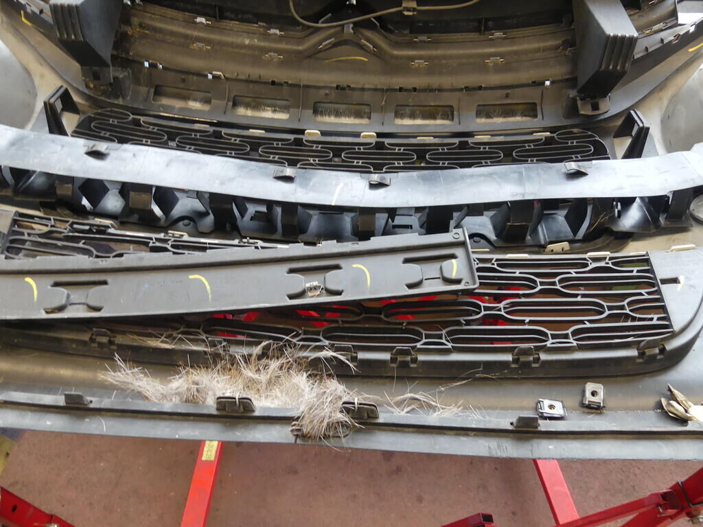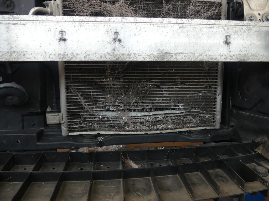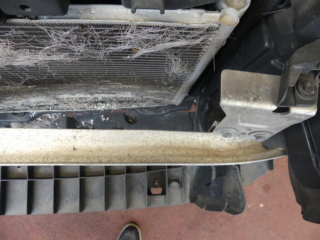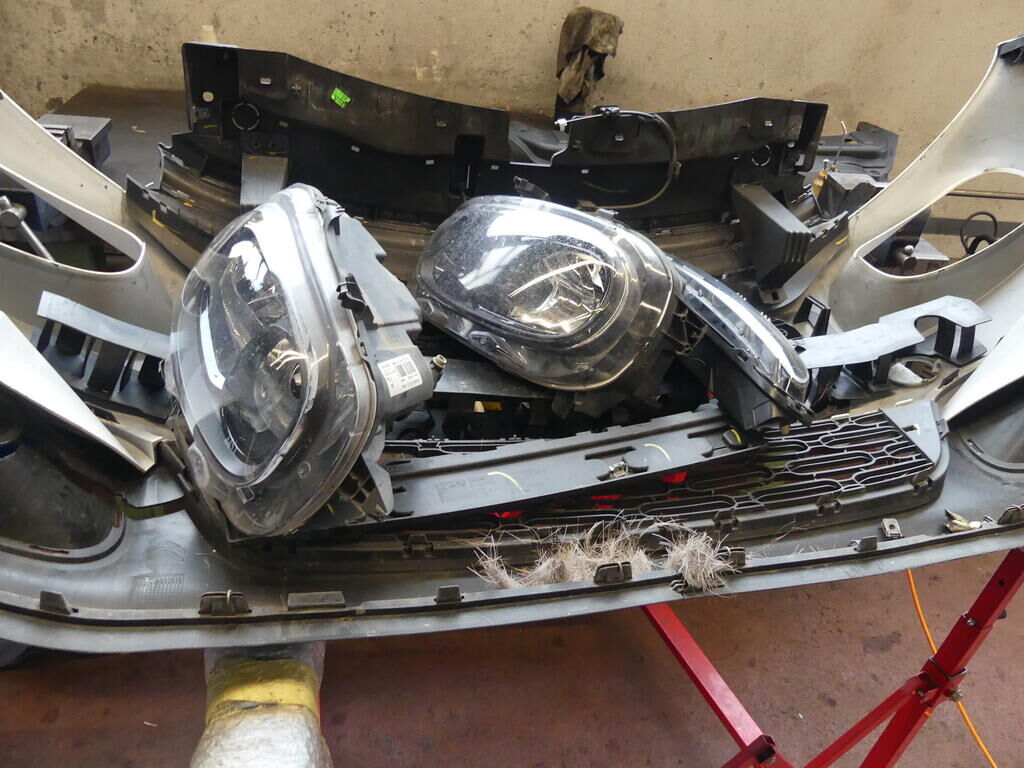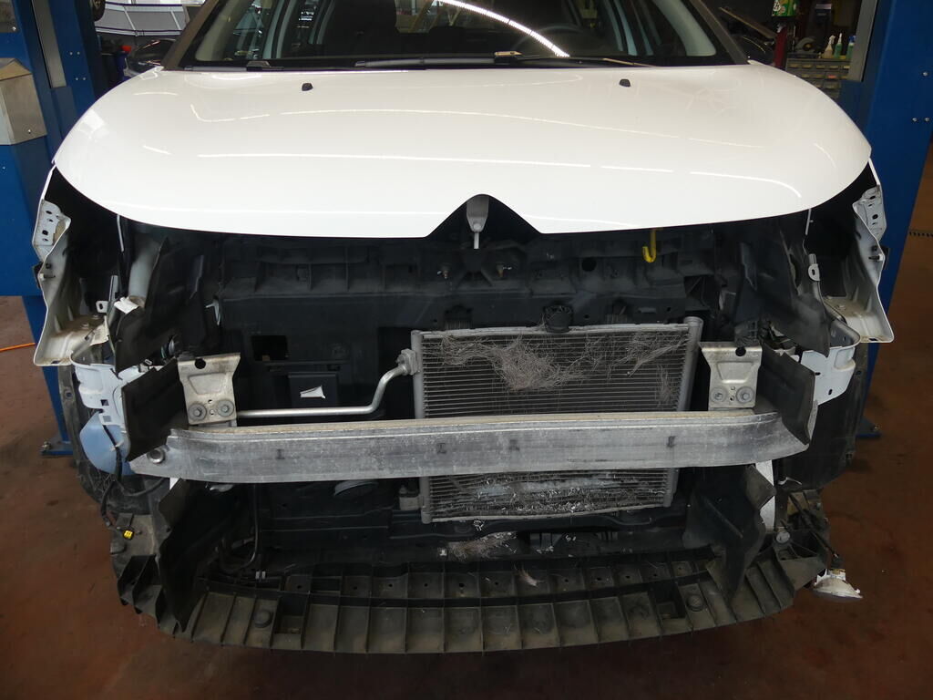 Stossstange gerissen, Kühlergitter gebrochen, Pralldämpfer, Scheinwerfer links und rechts, Nebellampen und Tagfahrlicht beschädigt. Klimakondensator deformiert. Motor Getriebe Vorderachse Hinterachse Airbags ausgelöst: 0 Nein ( Abfallcode 16.01.04ak )