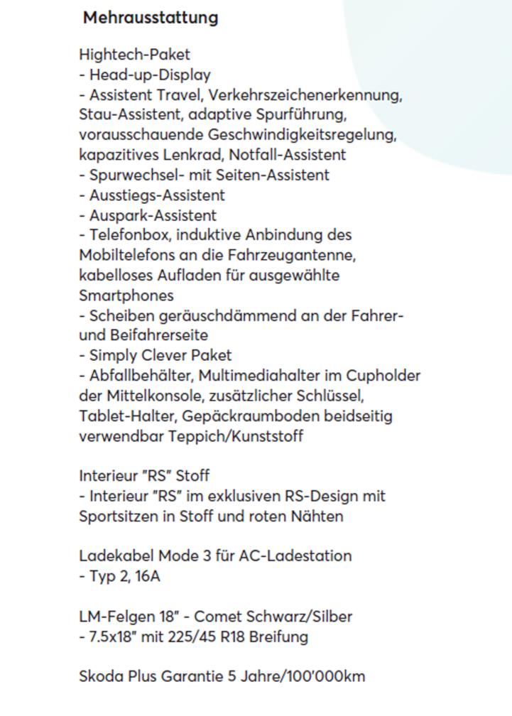 Skoda Octavia RS iV 245PS PHEV/Benzin mit Herstellergarantie 5 Jahre oder 100'000 Km ab 1. Inv. / PHEV Batterie 8 Jahre oder 160‘000 Km mit Sommer- (V5.5 H6mm) und Winterreifen (V5 H4mm) - 1 Set Felgen erst 22'170 Km gelaufen, mit Navigation, Rückfahrkamera, Head-up Display, Stau Assist, ACC, Lane Assist, Sportsitze, LED, LM Felgen 18“ Comet, AC Ladekabel, Lenkradheizung, Sitzheizung vorne uvm. (siehe Liste Fotos) Zu machen wäre: Öl-Service in 2400 Km 1 Beulchen drücken Motorhaube Spiegelschale VR lackieren 4 x CNC Felge Fussmatte Fahrerseite ersetzen Verkauf ab Platz. Besten Dank.