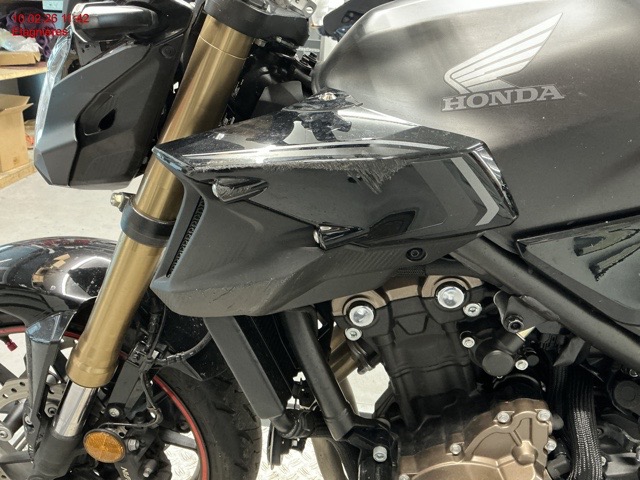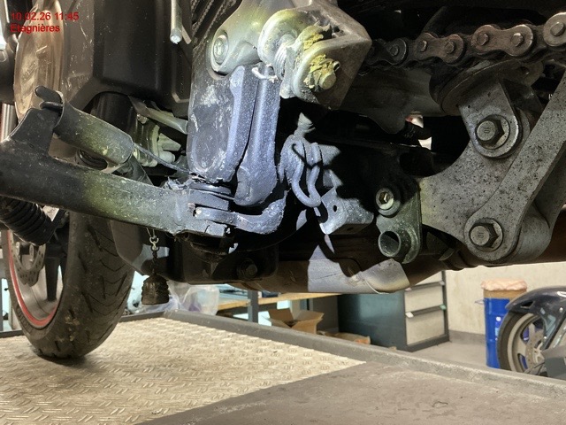 Embase de fourche avant gauche, guidon, levier de frein, indicateur de direction gauche, carénage gauche et droite, sélecteur de vitesse, repose pied, béquille latéral..... Cadre déformé (support béquille latéral), carter latéral moteur, liste non exhaustive / Dommages préexistants: selon photos