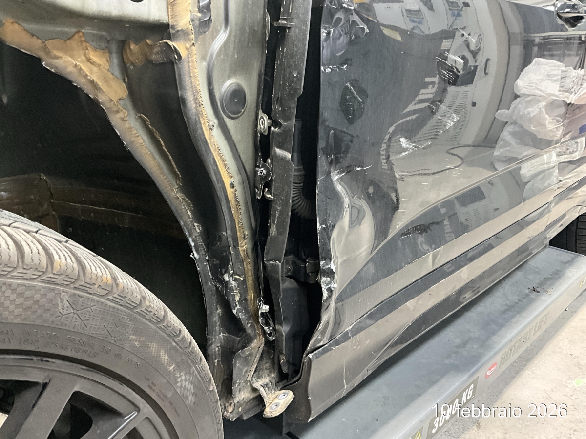 Beschreibung der Schäden: urto fianco sinistro, deformazione del montate A, lamierati esterni come porta, pf, piegatura sospensione sx, rottura PC