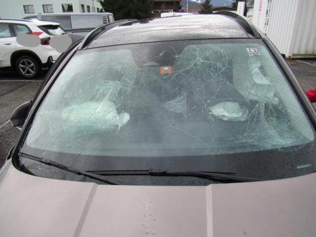 Fussgängerschutz ausgelöst. Front eingedrückt. Kotflügel vorne rechts und links eingedrückt. Frontblech/Maskenblech eingedrückt. Radhaus vorne rechts eingedrückt / gestaucht. Längsträger vorne rechts gestaucht. Fahrzeugvorbau verschoben.