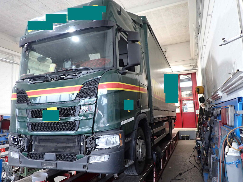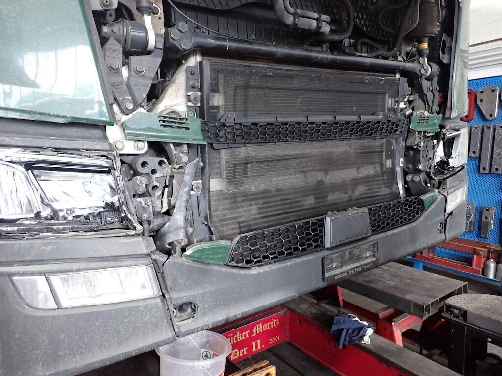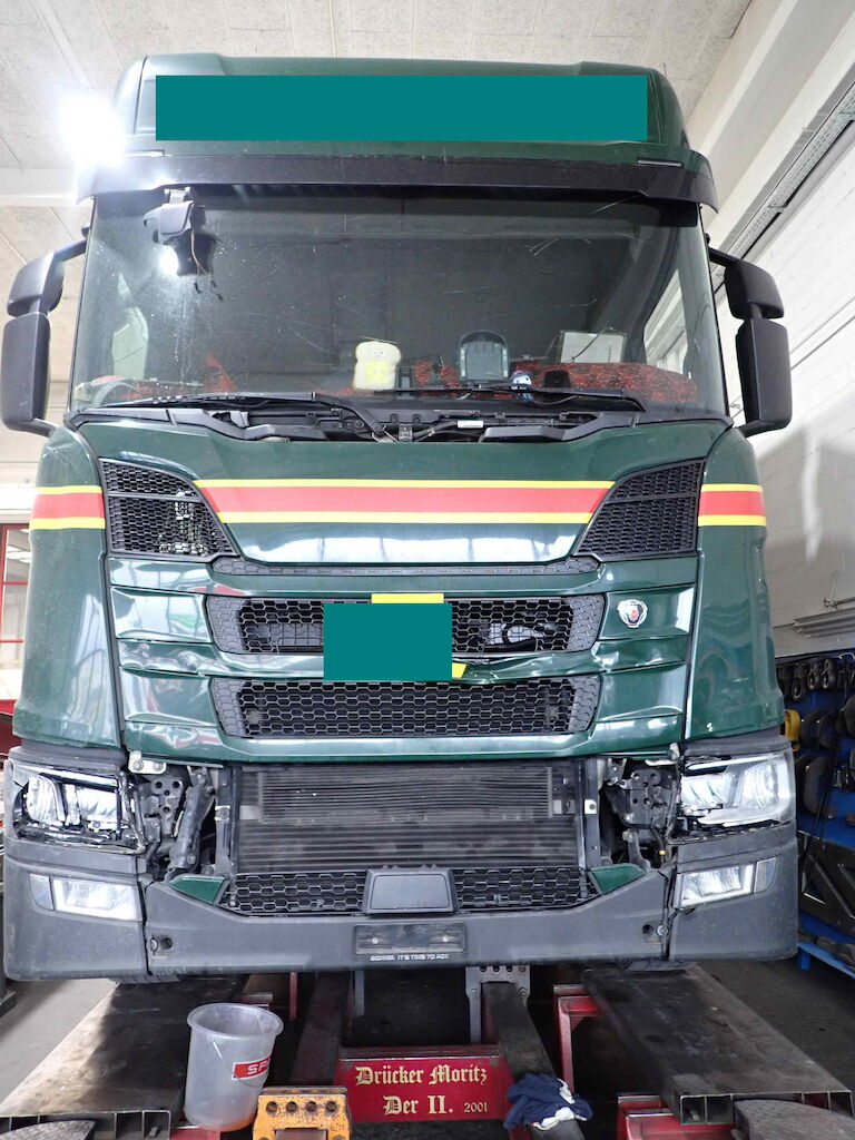 massiver Frontschaden: ganze Front, Frontblech, Scheinwerfer, Radar, Kühlerpacket, div. Sensoren und Anbauteile, Frontscheibe, Kabine verschoben, Rahmen verzogen, Kabinenblech hinten Motor Getriebe Vorderachse Hinterachse Airbags ausgelöst: 0 unbekannt ( Abfallcode 16.01.04ak )