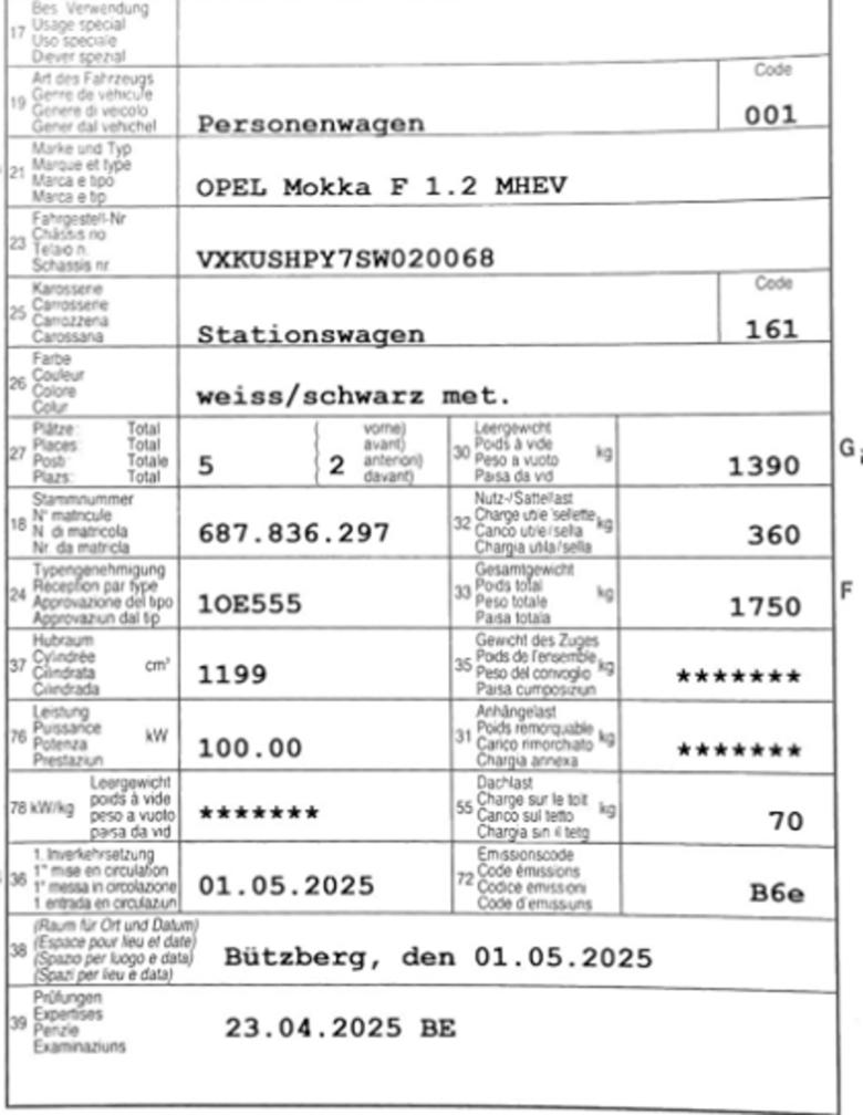 Opel Mokka GS 145PS Benzin/MHEV mit : Rückfahrkamera, Lenkradheizung, Sitzheizung vorne, Lane Assist, Tot-Winkel Warner, Keyless, LED Matrix, Park Assist uvm. Garantie: 12 Monate oder 20‘000 Km ab 1. Inv. Zu machen wäre: Gründliche Innenreinigung, vereinzelt Tierhaare aber kein Geruch Service Stossfänger hinten lackieren Dachrahmen L ausbessern Spiegelschale VR lackieren 1 x CNC Felge VL Scheibe Tür HL und Tür VR verkratzt Hutablage fehlt Führung Hagelschaden kann über Schadennummer abgerechnet werden (gemeldet bei Zurich) Verkauf ab Platz mit Sommer- und Winterreifen (V5 H4.5mm)