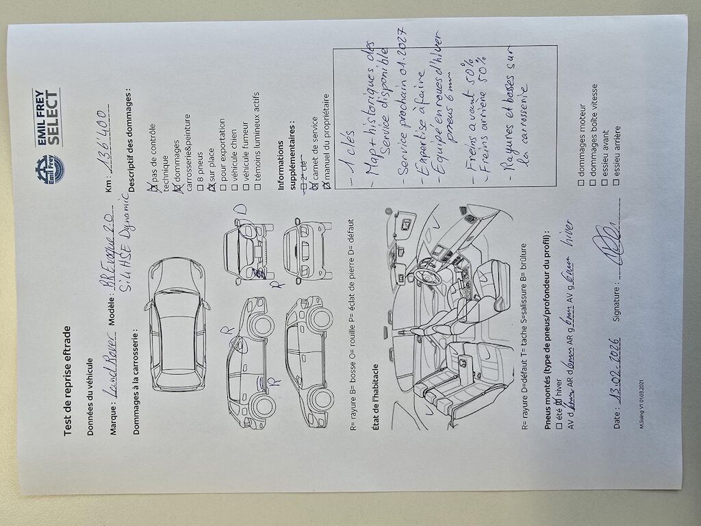 1 cléMap historique des services disponibleService prochain 01.2027Expertise à faire (21.06.2024)Equipé en roues d'hiver pneus 6 mmFreins avant 50 %Freins arrière 50 %Rayures et bosses sur la carrosseriePhare avant casséPas de contrôle technique (essai en route) effectué