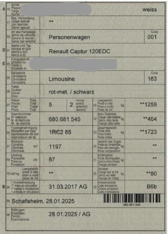 Airbag Fahrer und Beifahrerseite Sitzheizung vorne Elektrische Fensterheber vorne Aussenspiegel elektrisch verstellbar und heizbar Lederlenkrad Elektrische Fensterheber hinten ABS und EBV Elektr. Bremskraftverteilung Reifendruck-Kontrollsystem RDK Deaktivierung Beifahrerairbag Pack Colour Isofix-Kindersitzbefestigung Ledersitze Not-Bremsassistent mit Aktivierung der Warnblinkanlage Seitenairbags vorne ESP/ ASR/ CSV Tempomat mit Geschwindigkeitsbegrenzer Ersatzrad Dunkle Verglasung hinten Elektrische variable Servolenkung Keyless-Drive Hands-free Höhenverstellbarer Fahrersitz HSA Berganfahrassistent Rücksitzlehne geteilt 1/3 oder 2/3 / umklappbar Klimaanlage automatisch inkl. Pollenfilter Licht- und Regensensor Nebelscheinwerfer mit Corner Funktion Einparkhilfe hinten Stop + Start System LED Tagfahrlicht Aussenspiegel elektrisch einklappbar Leichtmetallfelgen 17" schwarz Dach in Kontrastfarbe Keine Gewähr auf die Angaben der Serienausstattungen DAB+ Digital Audio Broadcast R-Link Einparkhilfe hinten mit Rückfahrkamera Pack Sitze Pack Premium