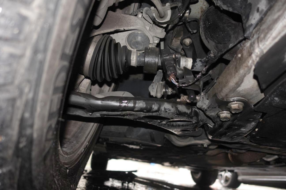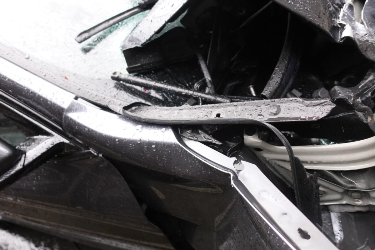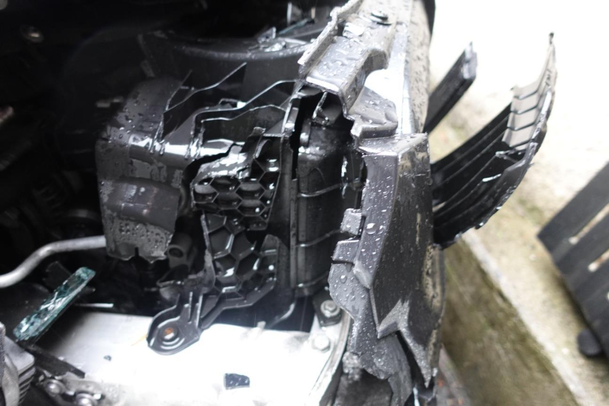Le véhicule a subi un choc inférieur. ATTENTION : Le véhicule ne démarre pas, batterie faible et verrouillage du capot bloqué. Essieu avant endommagé