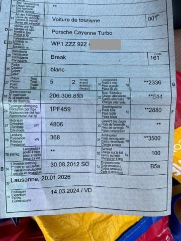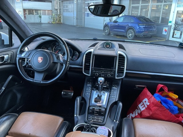 Airbag Fahrer und Beifahrerseite Elektrische Fensterheber vorne + hinten Metallic-Lackierung ABS Antiblockiersystem Luftfederung + Niveauregulierung Nebelscheinwerfer Zentralverriegelung mit Fernbedienung Heizbare Scheibenwaschdüsen Scheibenwischer mit Regensensor Reifendruck-Kontrollsystem RDK Dachhimmel Alcantara Park-Distanz-Sensor vorne + hinten Aussenspiegel elektrisch verstellbar/ heizbar und anklappbar Alarmanlage mit Innenraumüberwachung Einstiegsleisten Edelstahl Bose Surround Sound -System Lenksäule elektrisch verstellbar Sitzheizung vorne + hinten Zwei Zonen-Klimaautomatik ESP/ ASR/ MSR Aussenspiegel und Innenspiegel automatisch abblendend Vorhangairbags Seitenairbags vorne Tempostat Armauflage vorn Active Suspension Management PASM Dekorausstattung Aluminium gebürstet Lederausstattung Glattleder Rücksitze geteilt umklappbar 40/20/40 Glattlederlenkrad 3-Speichen Porsche Communication Management PCM LED Tagfahrlicht Pack Adaptive Sportsitze inkl. Komfort-Memory-Paket Treibstofftank 100 Liter Leichtmetallräder 19" Cayenne Turbo Keine Gewähr auf die Angaben der Serienausstattungen Lenkrad 3-Speichen mit Lenkradheizung Bi-Xenon-Scheinwerfer inkl. Dynamic Light System