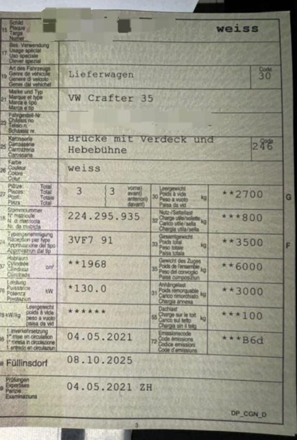 VW Crafter 35 Automat mit HebebühneBitte Text richtig lesenDas Fahrzeug ist im gross und ganzen in einem guten Zustand. Natürlich hat er seine gebrauchsspuren Beulen und Kratzer sind überall vorhanden.(Achtung Motor lauft nicht mehr richtig )Ursache unbekanntMan hat angefangen zu schauen aber nicht mehr weiter gemacht. Gewisse Teile wurden nicht mehr montiert.Ich bin selber auf den Anhänger gefahren. Das ist möglich.Automat lauft sauberMängelMotor lauft nicht richtigFahrersitz RissBeifahrerseite unten schwelle ( Siehe Foto genau an)Weitere Mängel nicht bekannt, aber nicht auszuschließen.Keine klimaTempomat hat erJahrgang:05.2021Kilometer: 290'xxxLetzte MFK: 05.2021Nutzlast: 800kg