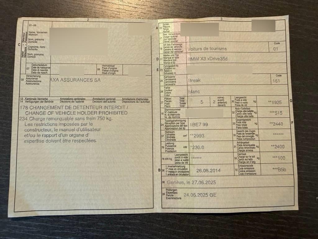 Make up-Spiegel links, Zentralverriegelung mit Fernbedienung, Stoff-Ausstattung, Dynamische Stabilitätskontrolle (DSC), Auto Start-/Stop-Anlage, AUX-Anschluss, Scheinwerfer-Waschanlage, Xenon-Lichtanlage, Bordcomputer, Hill Descent Control (HDC), Antiblockiersystem (ABS), Airbag: Airbag Fahrer und Beifahrer, Make up-Spiegel rechts, Klimatisierungsautomatik, Assist: Tempomat mit Bremsfunktion, Cupholder vorne, Durchladesystem, ISOFIX Kindersitzvorrichtung, Allradantrieb permanent, Innenspiegel automatisch abblendbar, Aussenspiegel rechts und links beheizbar und elektrisch verstellbar, Performance Control, Reifendruckverlust-Warnsystem, Blinker in Aussenspiegel, Abschliessbare Radschrauben, Airbag: Seitenairbag für Fahrer und Beifahrer, Lenkung, elektrisch unterstützt, Nebelscheinwerfer, Reifen mit Notlaufeigenschaft, Window-Kopfairbags, Zusätzliche 12V Steckdosen, DAB+ (Digital Audio Broadcasting), Sitze: Ausführung 5 Sitzplätze, 8-Stufen-Automat sequentiell, Bremsassistent (BAS), Dekor: Interieurleisten in Satinsilber matt, Radio BMW Professional, Start-/Stop-Knopf, Mittelarmlehne hinten, Intelligenter Notruf, Airbag: Airbag Beifahrer deaktivierbar, Lackierung: Uni-Lackierung, Partikelfilter und Oxydationskatalysator, Aktive Kopfstützen, Steckdose 12V, Sport-Lederlenkrad, Mittelarmlehne vorne, Veloursfussmatten vorne und hinten, Drittes Bremslicht, Lenkrad: Multifunktionslenkrad, Assist: Dynamische Traktionskontrolle (DTC), Leichtmetallfelgen im V-Speiche 307, 18J, Lenkrad: Lenkrad längs- und höhenverstellbar, Bremsbelag-Verschleissanzeige, Hochgeschwindigkeitsabstimmung, Bremsenergie-Rückgewinnung, Automatische Parkbremse, TeleService, Fahrerlebnisschalter inkl. ECO PRO