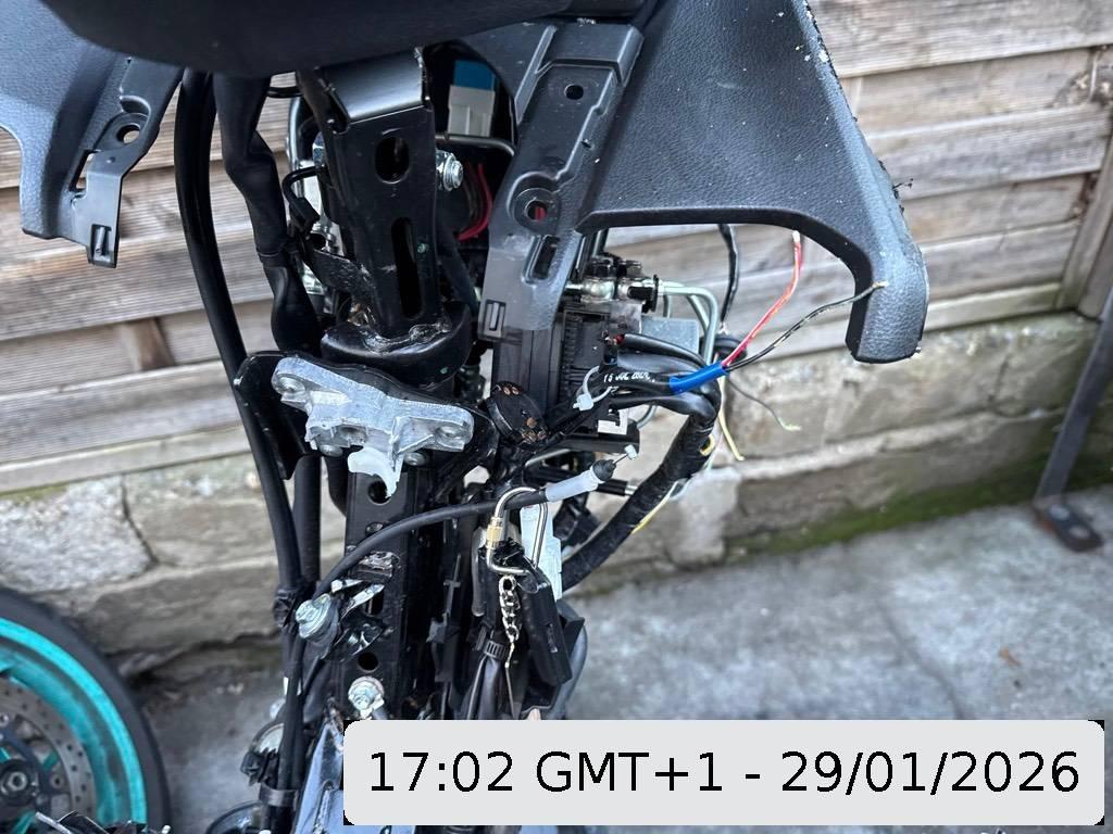 Armaturen, Auspufftopf, Aussenspiegel links, Aussenspiegel rechts, Diverse Anbauteile, Front, Fussraster links, Fussraster rechts, Gabelholm, Griff links, Griff rechts, Heck, Heckverkleidung, Kabelstrang, Kupplungsgehäuse, Kühler, Lenker, Lenkschloss, Motorgehäuse, Rad vorne, Rücklicht, Scheinwerfer, Schutzblech hinten, Schutzblech vorne, Seite links, Seite rechts, Verschalungen hinten, Verschalungen links, Verschalungen rechts, Verschalungen vorne, Zündschloss