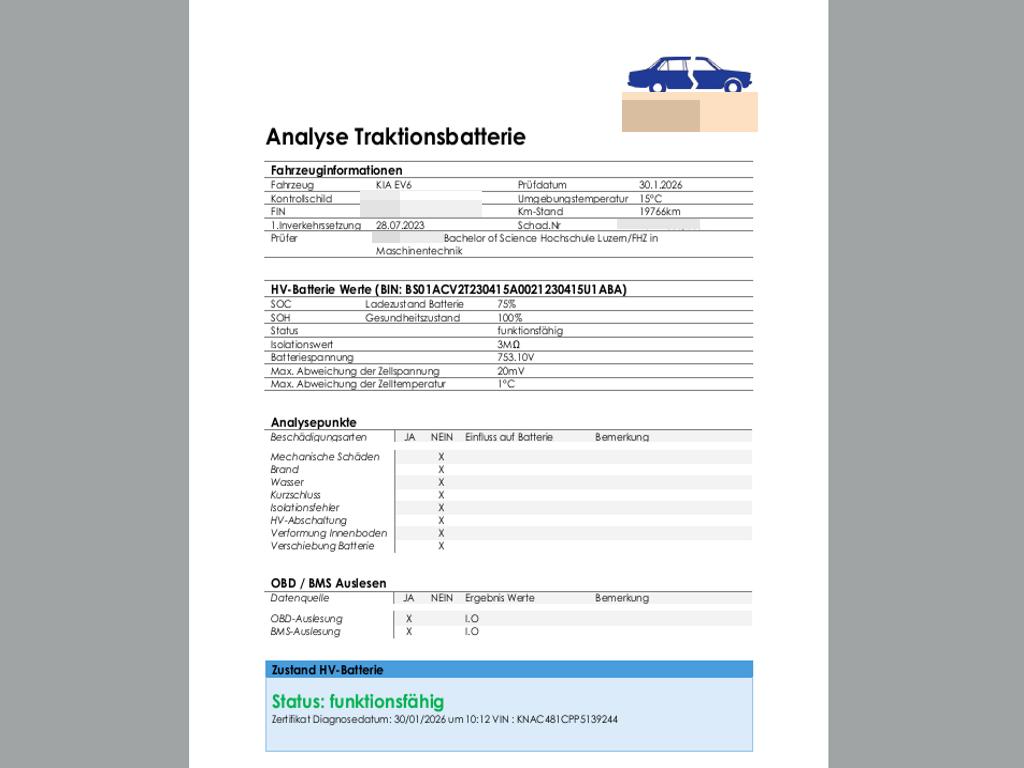 Die Hochvoltbatterie wurde geprüft und ist funktionsfähigDas Fahrzeug wird mit der HV-Batterie verkauftDie (vom Fahrzeugexperten) ermittelten Reparaturkosten beziehen sich auf das versicherte Ereignis. Allfällige zusätzliche, nicht versicherte Schäden/Vorschäden, sind in den Reparaturkosten nicht enthalten. Die deklarierten Ausstattungsmerkmale können von der effektiven Ausstattung abweichen.AchtungBei einem Hochvoltsystem - Spannungsfreiheit prüfen. Sicherheitshinweise und Betriebsanleitungen des Herstellers konsultieren und befolgen.