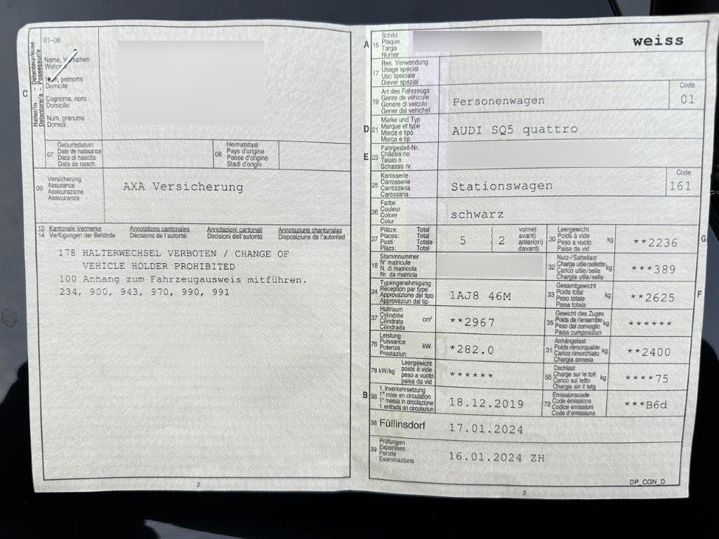 Warndreieck, Elektronisches Stabilitäts-Programm (ESP), Gepäcktrennnetz, Alu-Räder im 5-Doppelspeichen -Stern-Design,kontrastgrau, teilpoliert 20J, Mittelarmlehne vorn in Kunstleder schwarz mit Kontrastnaht in Rot, Licht: LED Heckleuchten, Sitze: Sportsitze vorne, Tempomat, Aussentemperaturanzeige, Antriebsschlupfregelung (ASR), Standheizung/-Lüftung mit Fernbedienung, USB-Schnittstelle und Multimediabuchse AUX-IN, Lichtsensor, Licht: Nebelschlussleuchte, Höhenverstellbare Gurten vorne, Heckscheibenheizung, Servotronic, Dekoreinlagen in Aluminium matt gebürstet, Vordersitze elektrisch verstellbar, 3-Punkt-Sicherheitsgurte auf allen Plätzen, Gepäckraumklappe automatisch öffnend und schliessend, Dachreling eloxiert, Elektrische Fensterheber vorne + hinten, Drehzahlmesser, Ablagen in den Türen, Leder-Multifunktion plus Lenkrad im 3-Speichen-Design, Alcantara Frequenz-/Leder-Ausstattung, Zentralverriegelung mit Fernbedienung, Kofferraummatte, Innenspiegel automatisch abblendbar, Wegfahrsperre elektronisch, Partikelfilter und Oxydationskatalysator, Lenkrad: Lenkrad längs- und höhenverstellbar, Wärmeschutzverglasung, Aussenspiegel rechts und links beheizt, elektrisch verstell- / und einklappbar, Fahrwerk: Sportfahrwerk, Aussenspiegel in Alu, Antiblockiersystem (ABS), Akustikglas, Licht: Drittes Bremslicht, Wendeladeboden, Notrufsystem, Kreuzstützen für Vordersitze verstellbar, Klima: Pollenfilter (Staubfilter), Getriebe: 8-Stufen-Automat sequentiell, Dachträger, Elektronische Parkbremse, Innenleuchten LED, Räder: Reifendruck-Kontrollanzeige, Kindersitzvorrichtung ISOFIX mit Deaktivierungsschalter für Beifahrer- Airbag, Licht: LED Scheinwerfer, Paket: Glanzpaket, Media: MMI Radio plus, Media: 8 Lautsprecher, Garantie: 2 Jahre ohne Kilometerbegrenzung (ab 1. Inv.), Leseleuchten, Stopp-/Start-System, Media: Digitaler Radioempfang (DAB), Veloursfussmatten vorne und hinten, Ohne Motorenbezeichnung, Klima: Klimatisierungsautomatik, Wartungsintervall-Anzeige, Audi drive select, Einstiegsleisten Carbon Camouflage matt, Räder: Reifenreparatur-Set (Tire Fit), Alu-Räder 8Jx18 5-Arm-Stern-Design, Media: Bluetooth-Schnittstelle, Regensensor für Scheibenwischer vorne, Elektronische Differentialsperre (EDS), Digital Uhr, Allradantrieb permanent, Scheibenwischer vorne mit Intervall, Fahrer-Informationssystem mit Farbdisplay, Licht: Tagfahrlicht, Assist: Bremsassistent (BAS), Verbandskasten, Elektrische Kindersicherung, Sitze: Vordersitze heizbar, Radwechselwerkzeug, Dachhimmel schwarz, Rücksitzbank ungeteilt,Lehne geteilt umlegbar (dreiteilig) mit Mittelarmlehne