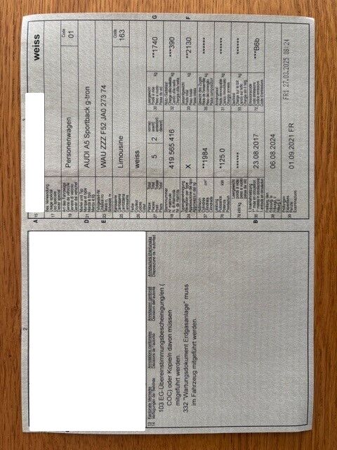 Der Wagen ist lückenlos von einer Audi-Vertretung gewartet worden.• 2025 MFK problems bestanden• S-Line Ausführung mit Vollaustattung• G-Tron Erdgas/Benzin Fahrzeug• 8 Fach-Bereift mit Größe 8,5 J x 19 mit Reifen 255/35 R 19; und Winterkomplettrad im 10-Parallelspeichen-Design 8x18 ET31, 245/40 R18 97V XL, Sommer und Winterreifen wurden Q4/2024 erneuert. Bremsen wurden vor 12 Monaten erneuert.• Wagen ist in einem sehr guten Zustand, hatte kein Unfall, keine Blechschäden, viel Autobahn-km